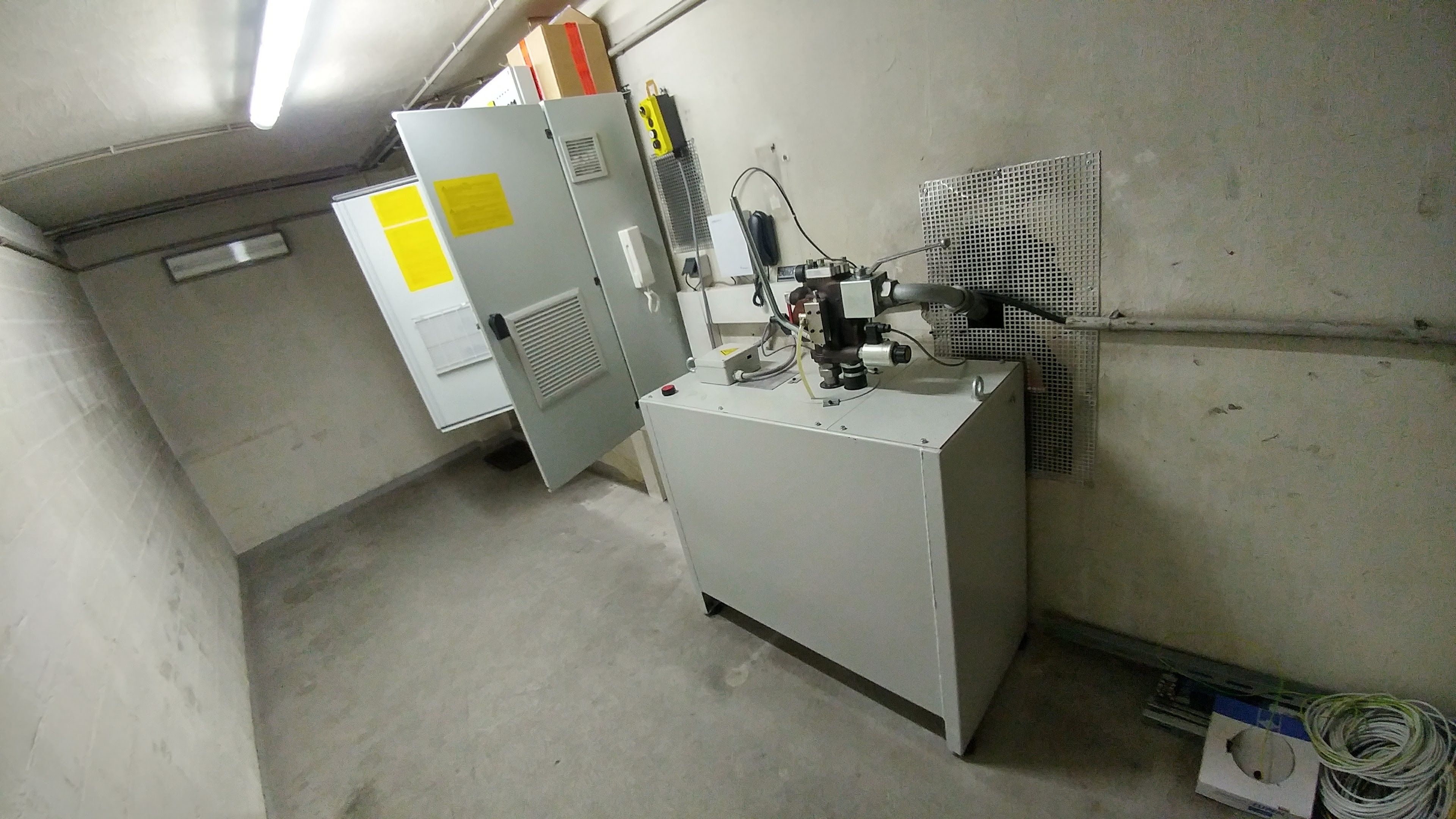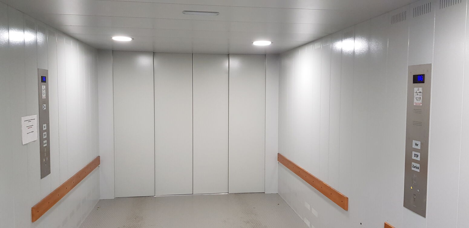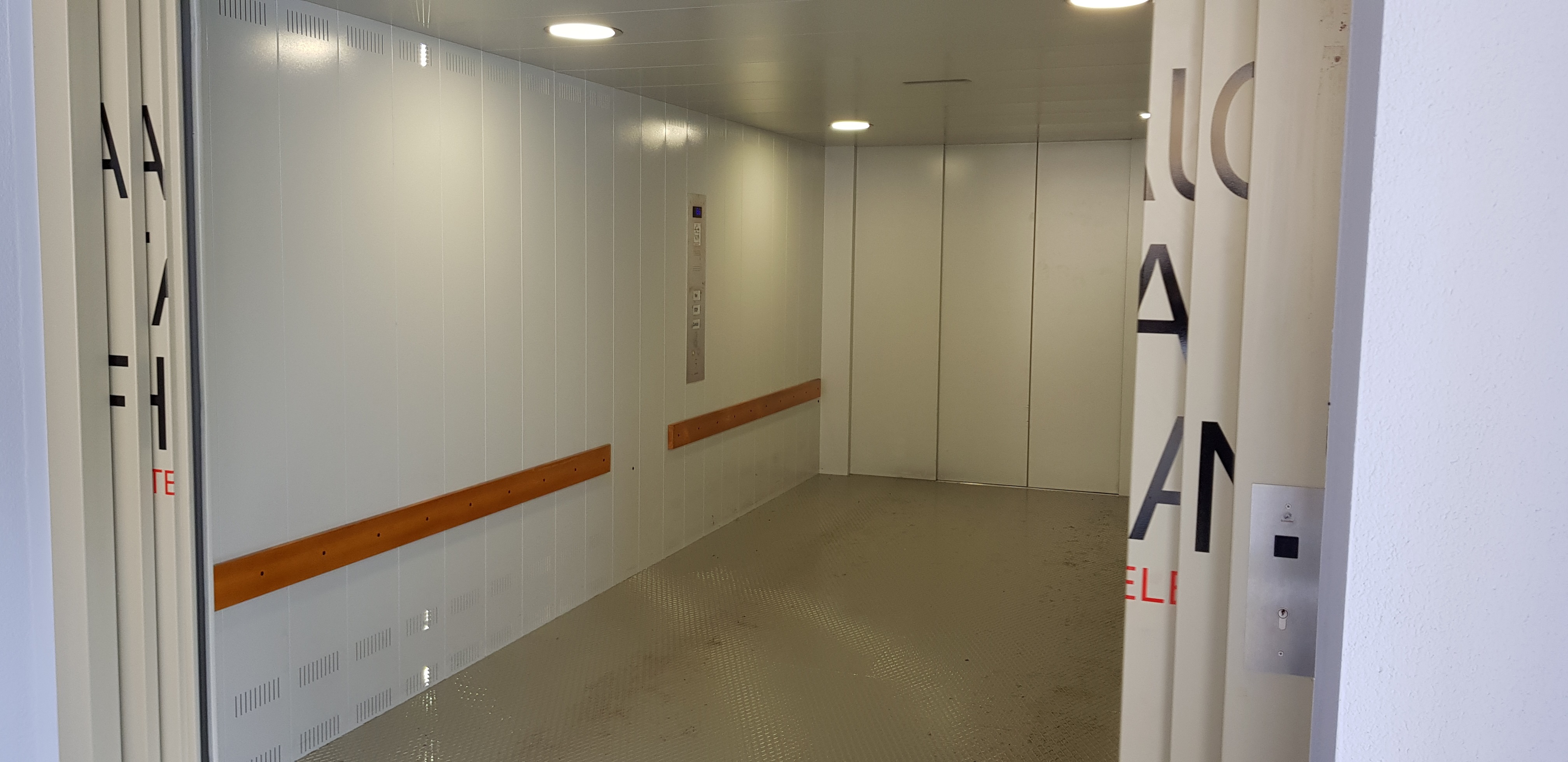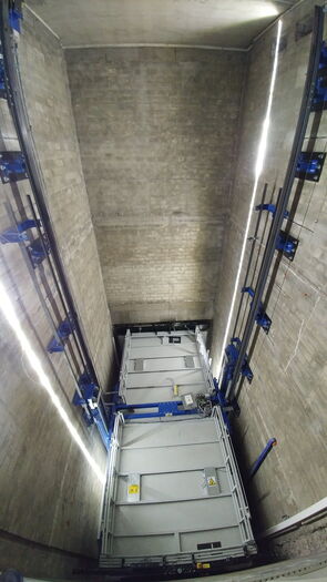Anlage mit 2 Haltestellen, ohne Durchladung 180º, 4300 Kg Nutzlast und eine Geschwindigkeit von 0.3 m/s. Aufhängung 2:1. Parkhilfe in der Kabine, Handsender für den Ruf von jeder Haltestelle.