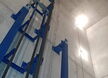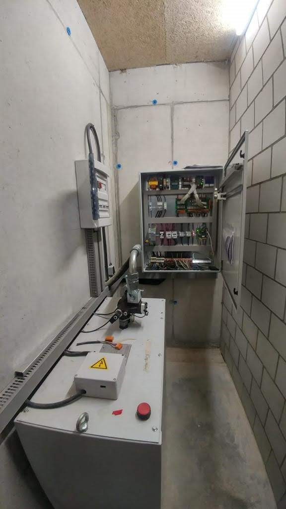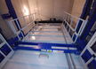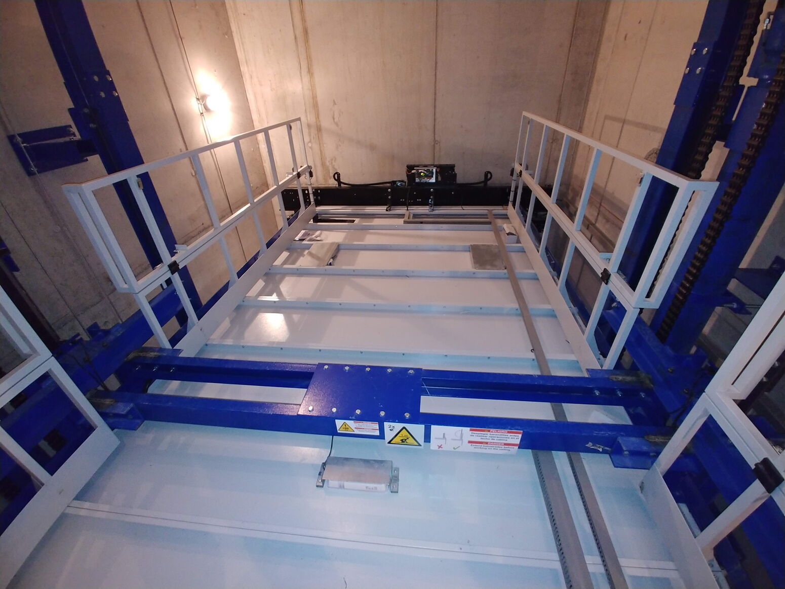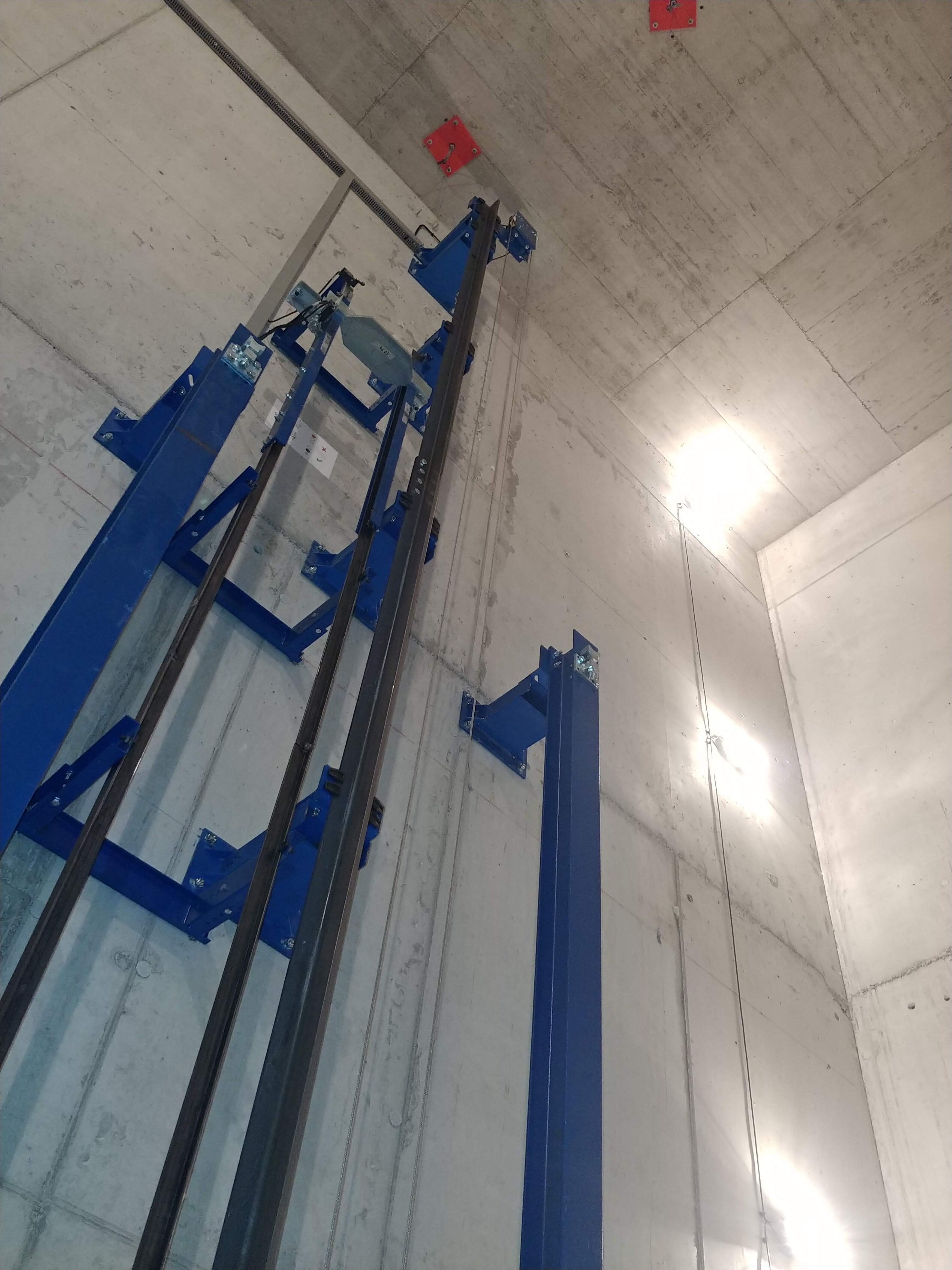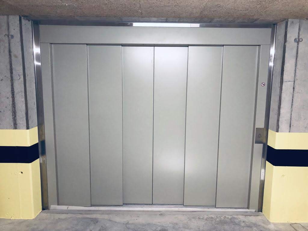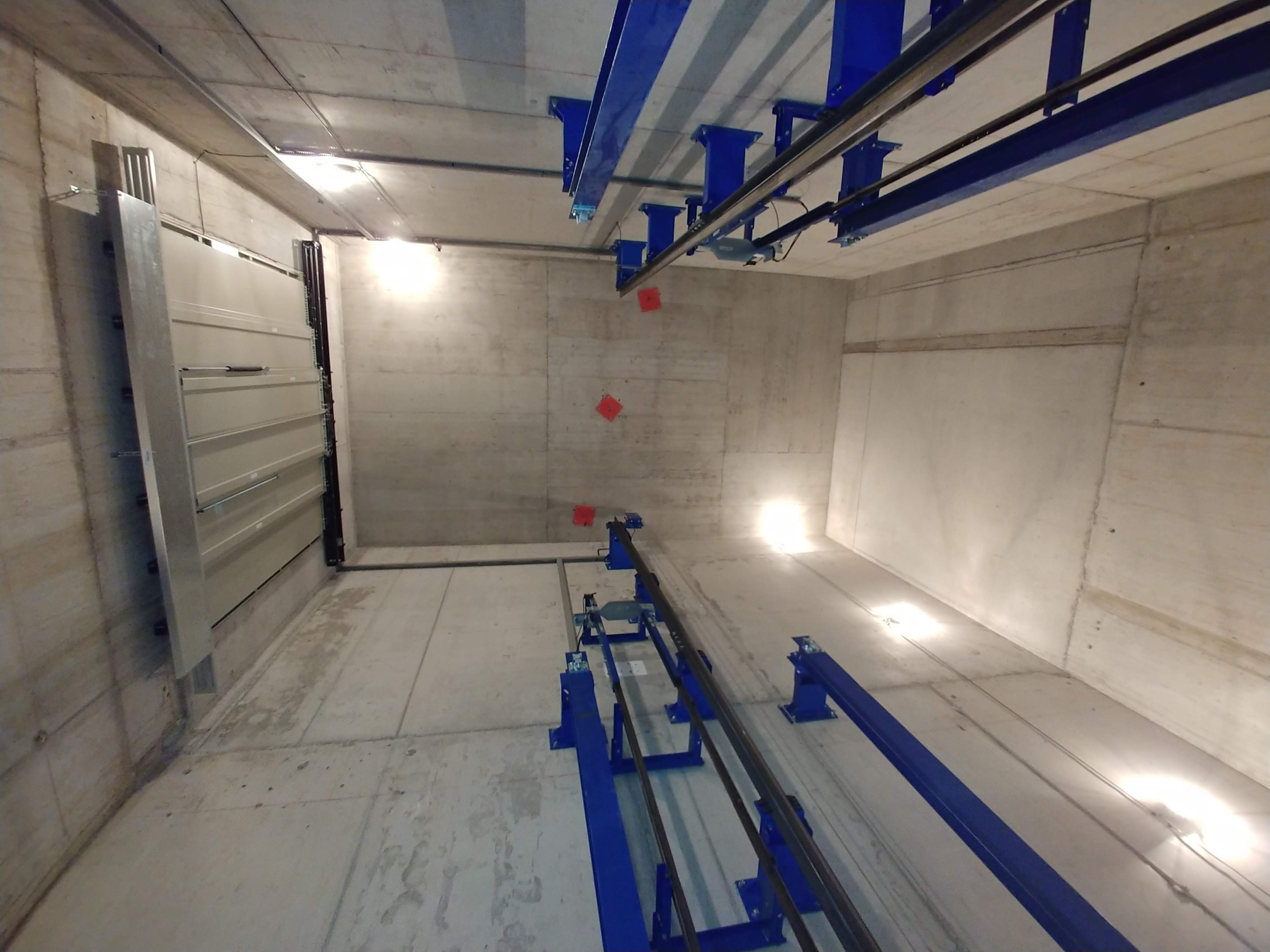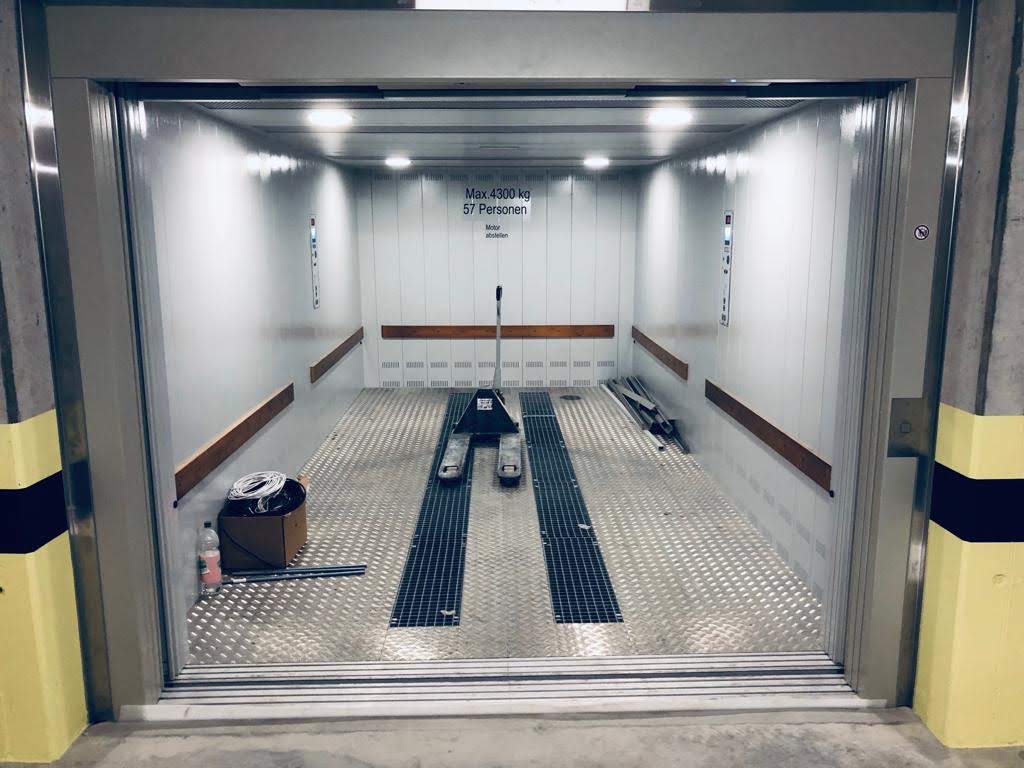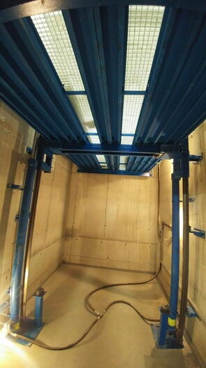 Anlage mit 2 Haltestellen, ohne Durchladung 180º, 4300 Kg Nutzlast und eine Geschwindigkeit von 0.2 m/s. Aufhängung 1:1. Parkhilfe in der Kabine, Handsender für den Ruf von jeder Haltestelle.
