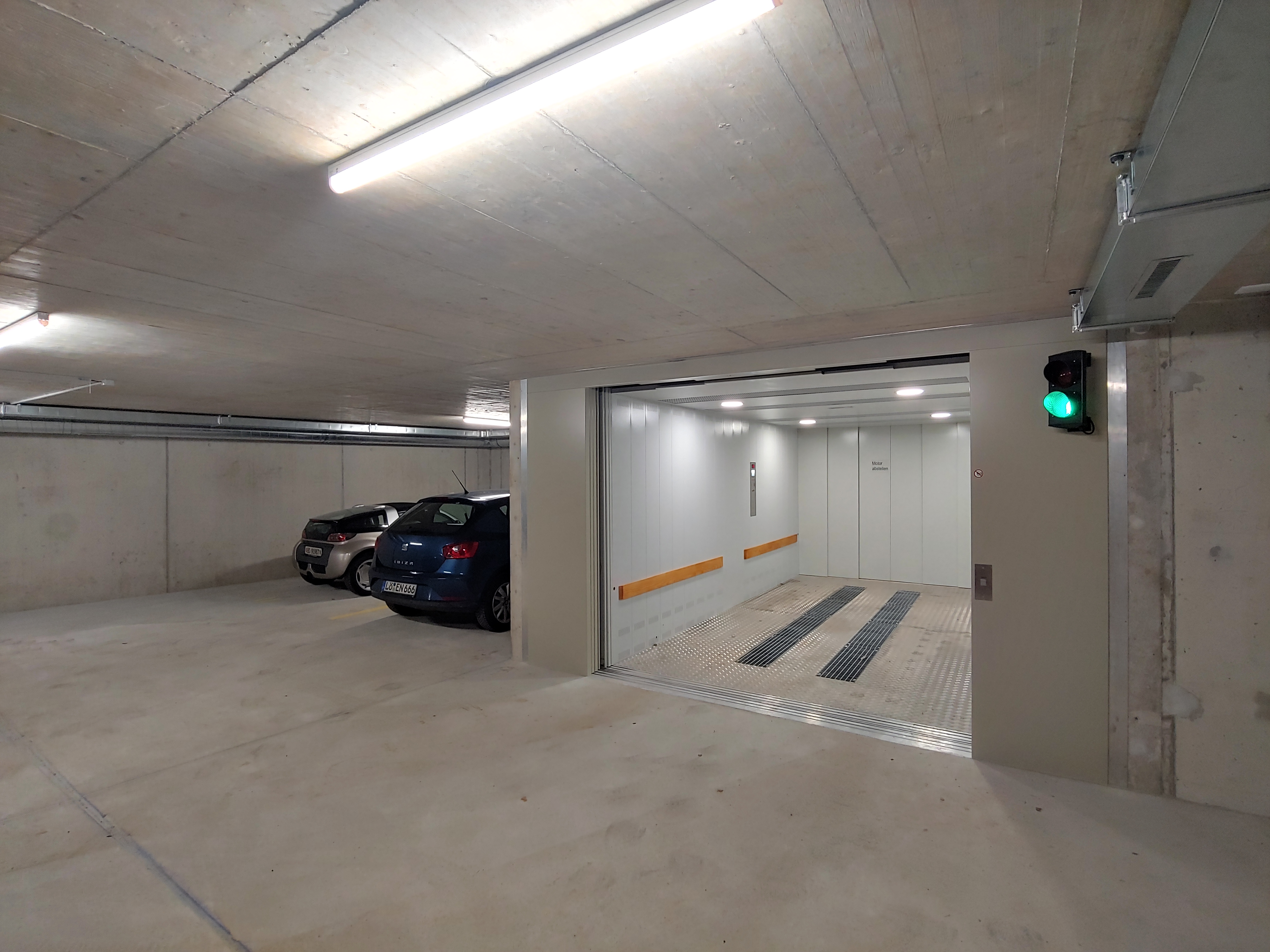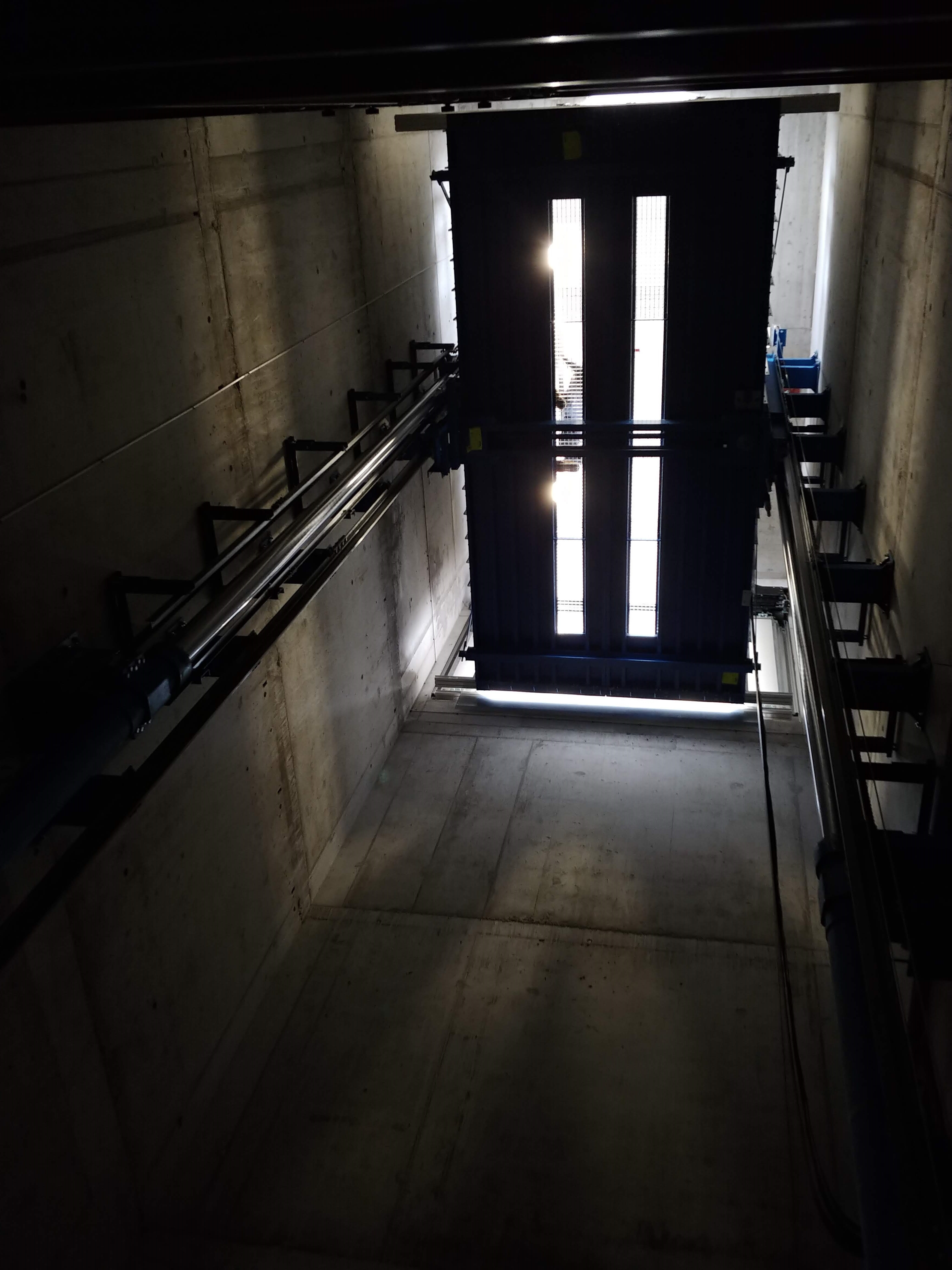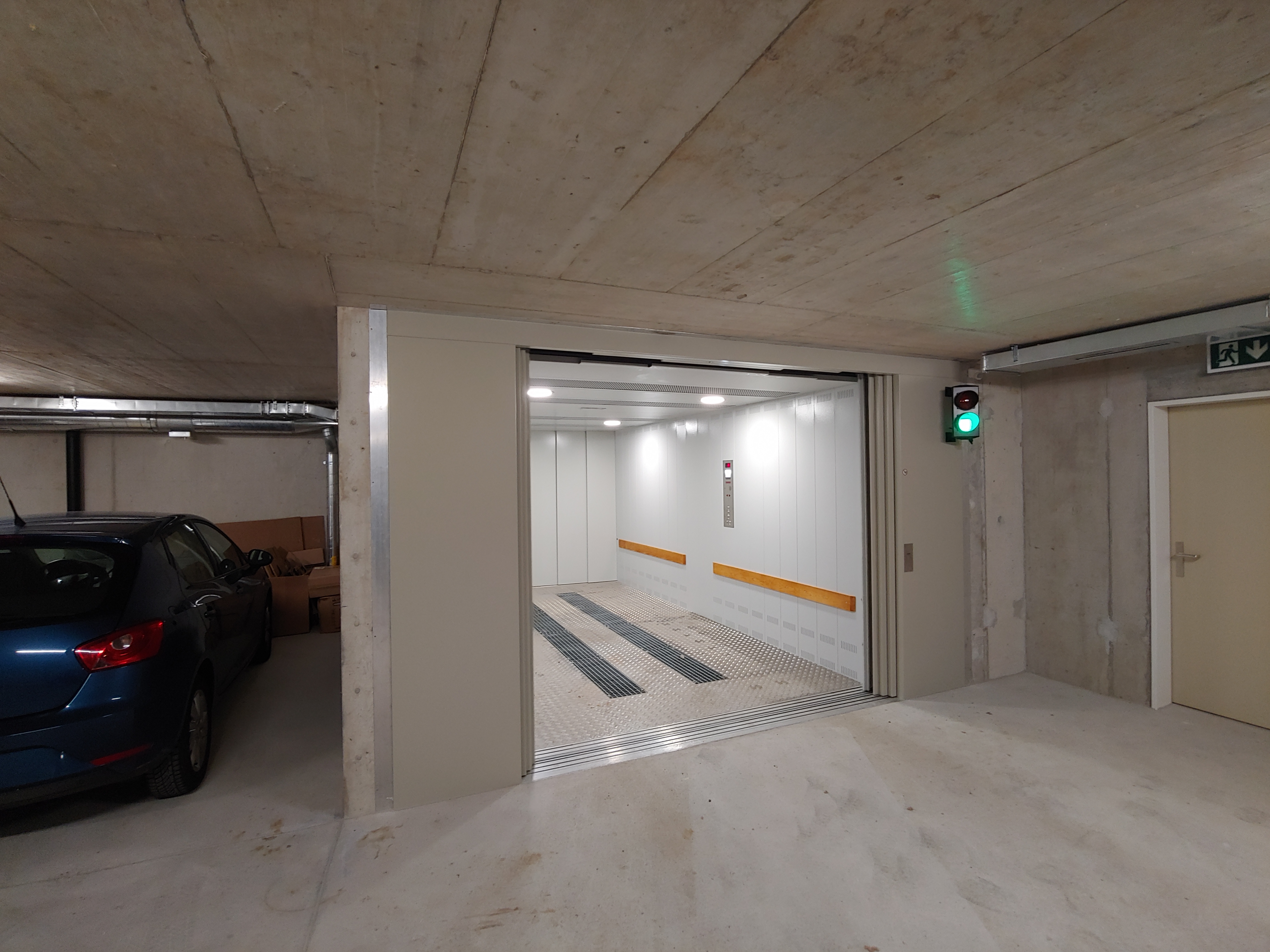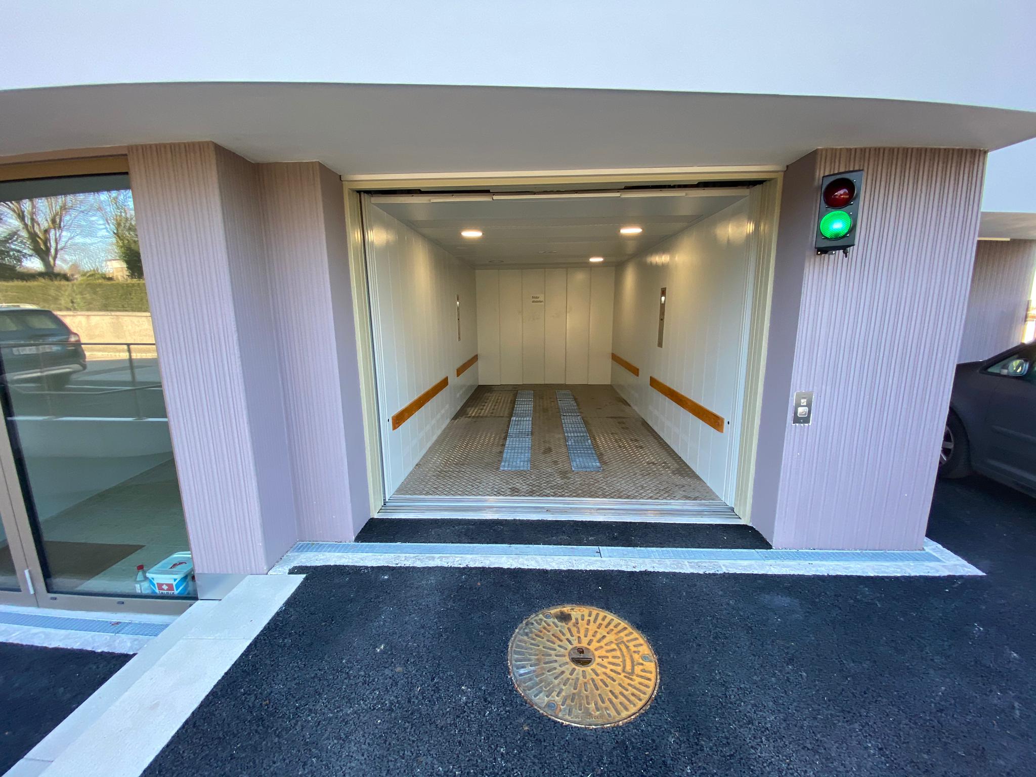 Anlage mit 3 Haltestellen, 4000 Kg Nutzlast und eine Geschwindigkeit von 0.3 m/s. Aufhängung 2:1. Parkhilfe in der Kabine, Handsender für den Ruf von jeder Haltestelle aus und Aussenampel.