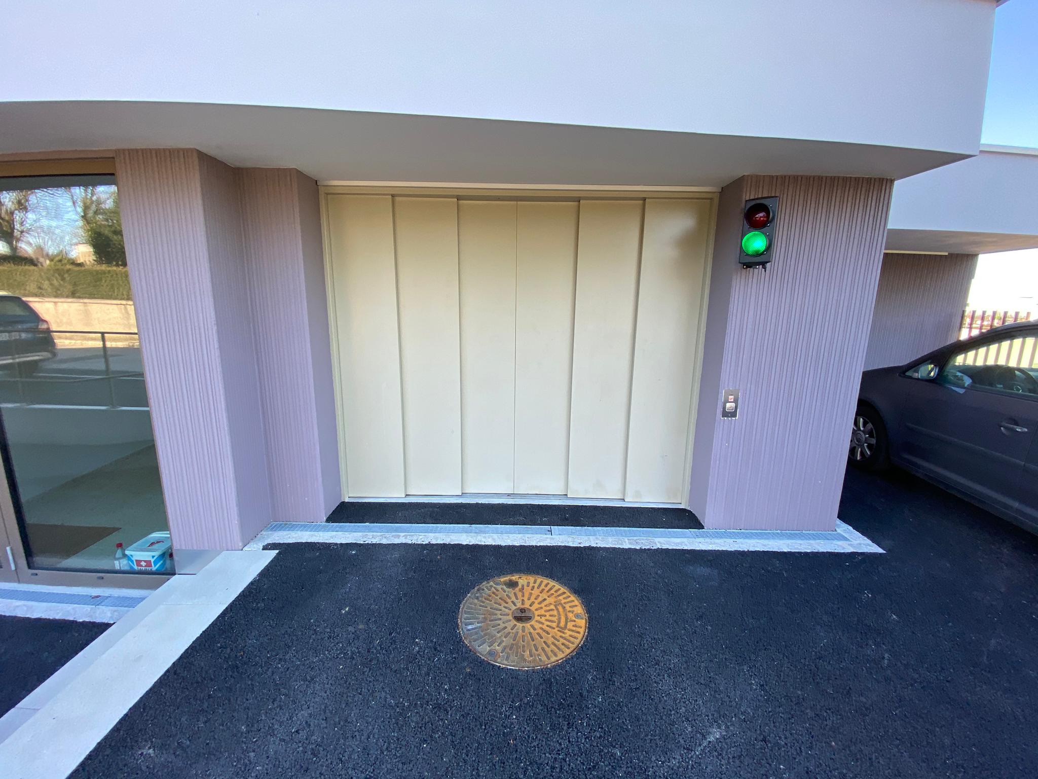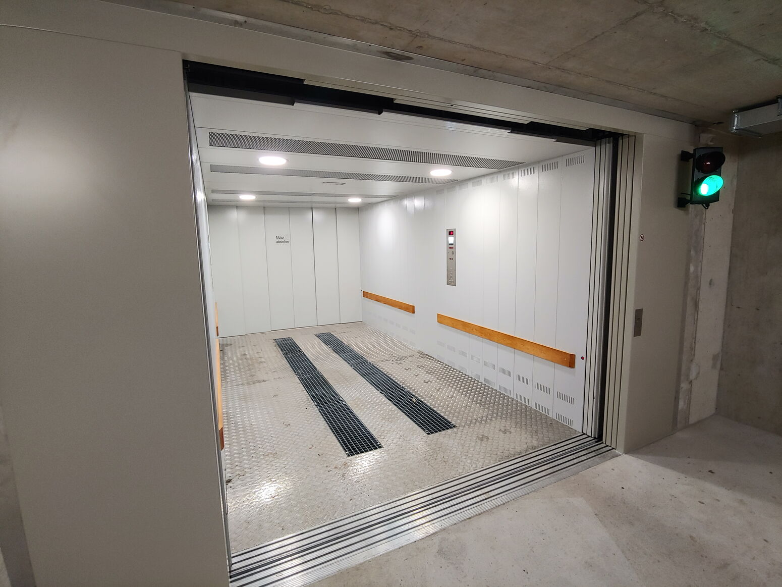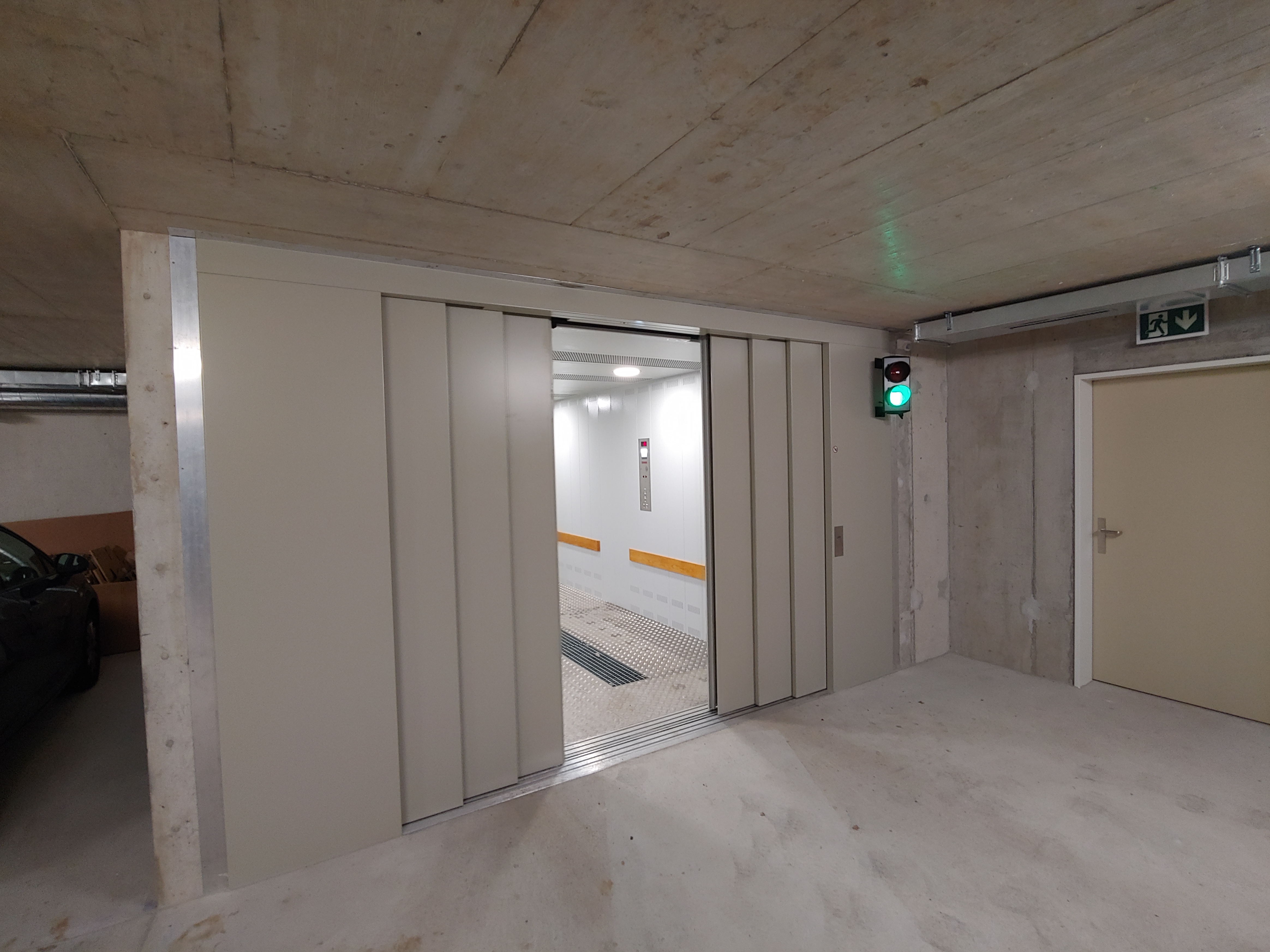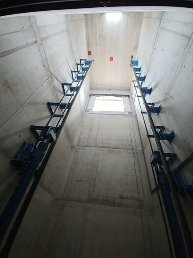 Anlage mit 3 Haltestellen, 4000 Kg Nutzlast und eine Geschwindigkeit von 0.3 m/s. Aufhängung 2:1. Parkhilfe in der Kabine, Handsender für den Ruf von jeder Haltestelle aus und Aussenampel.
