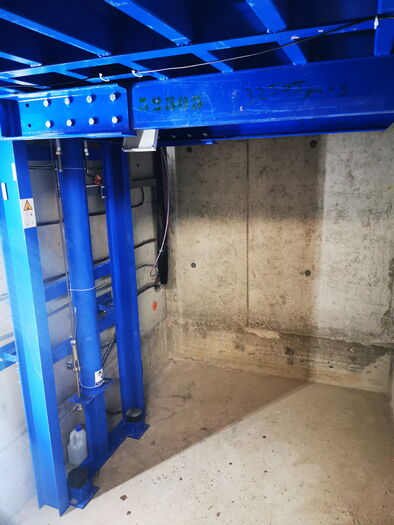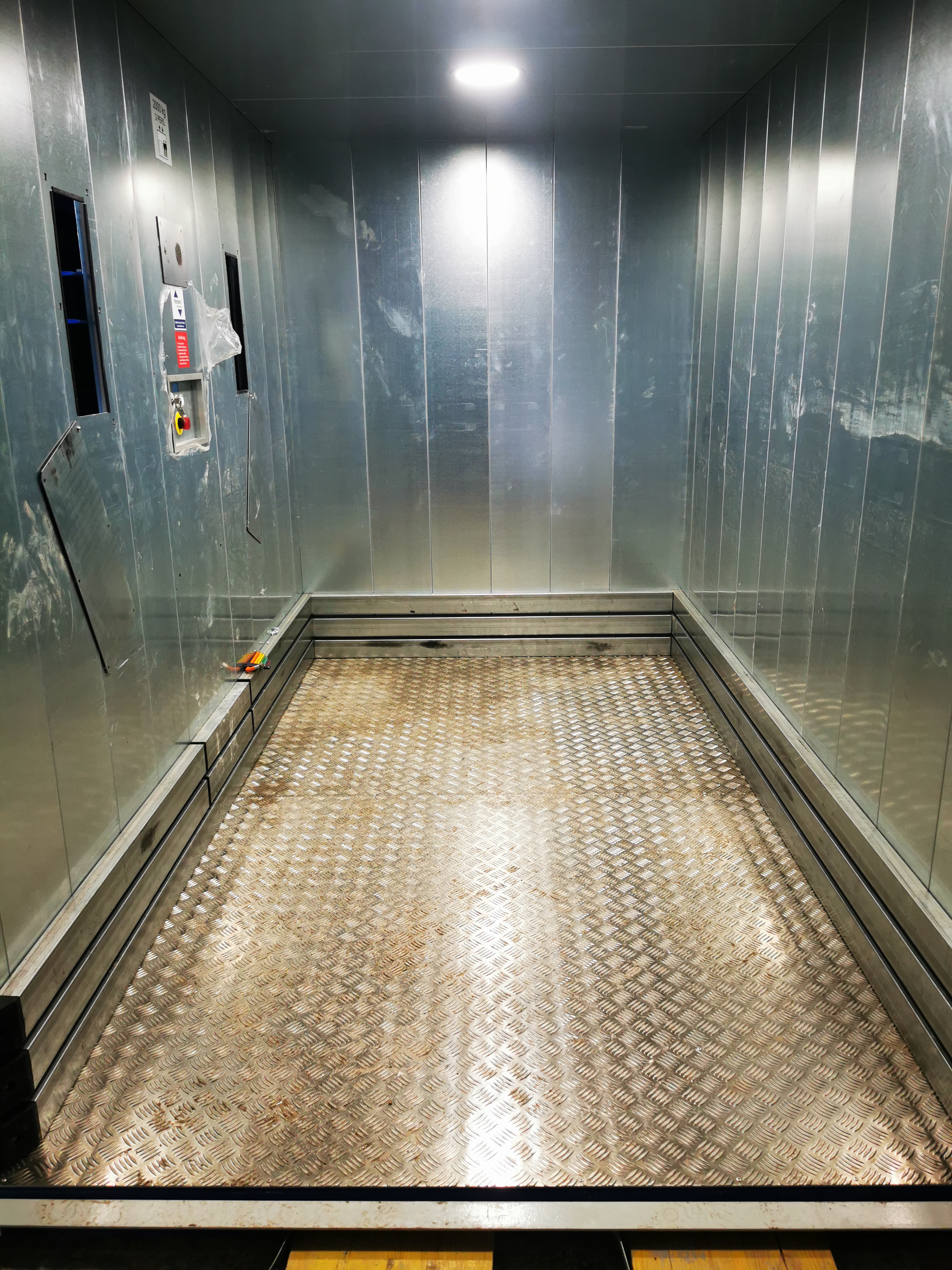 Es handelt sich um einen Warenlift EHM-1500 mit einer Nutzlast von 2000 Kg, 2 Halt, mit Kabine aus Stahlblech verzinkt und Aluminium Boden.