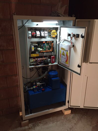 Hydraulische Anlage mit 4 Haltestellen, gleichseitig, Rücksacksystem seitlich, Aggregat und Steuerung neben dem Liftschacht in der untersten Halt und Schachttüren mit kleinen Sichtfenster. Dieses System ist mit Todmannsteuerung und ohne Kabinenabschlusstür baumustergeprüft!