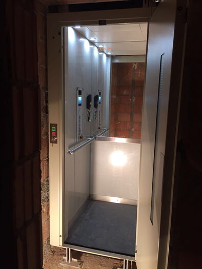 Wunderbares Homelift in einem Einfamilienhaus in Delemont, Schweiz. Eingebaut in einem Schacht mit Mauerwerk mit Klebeanker.