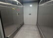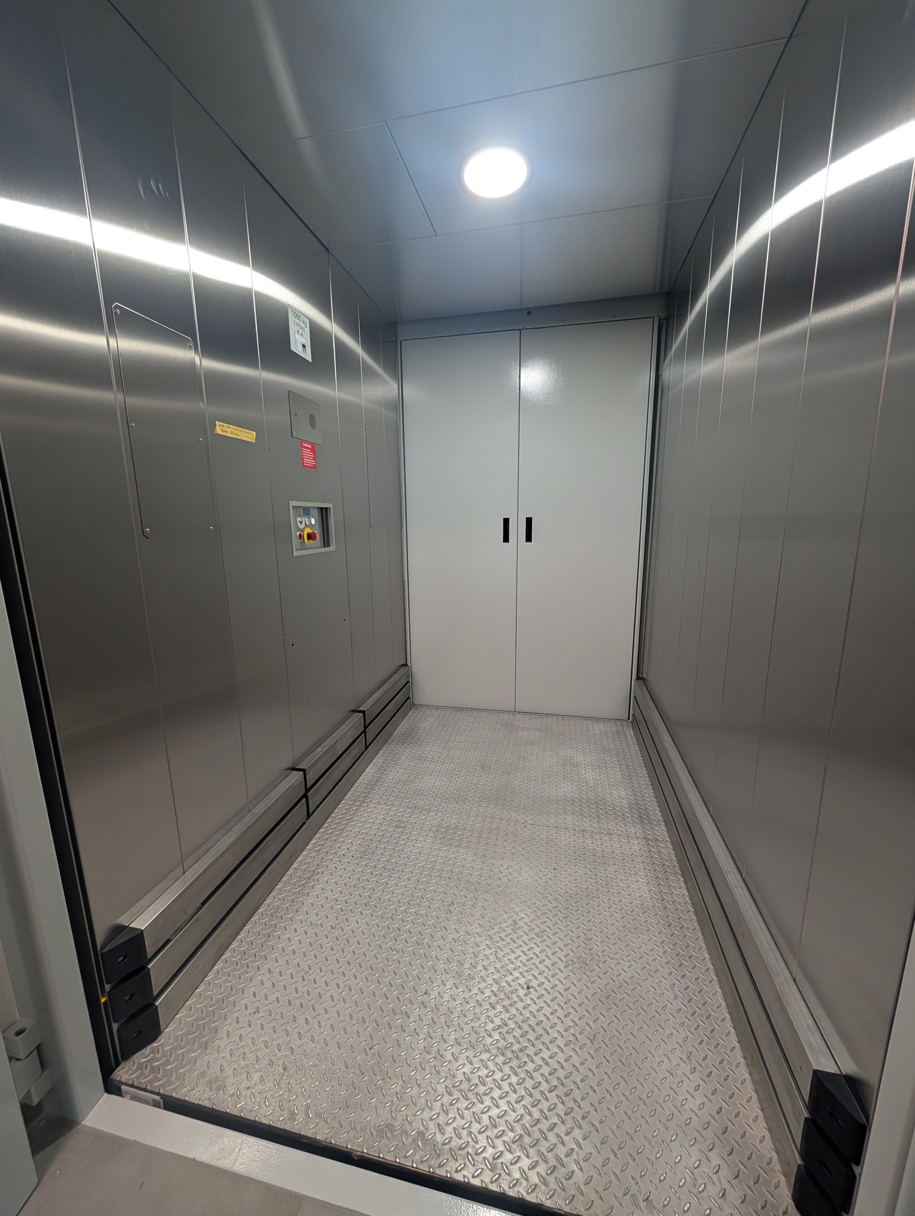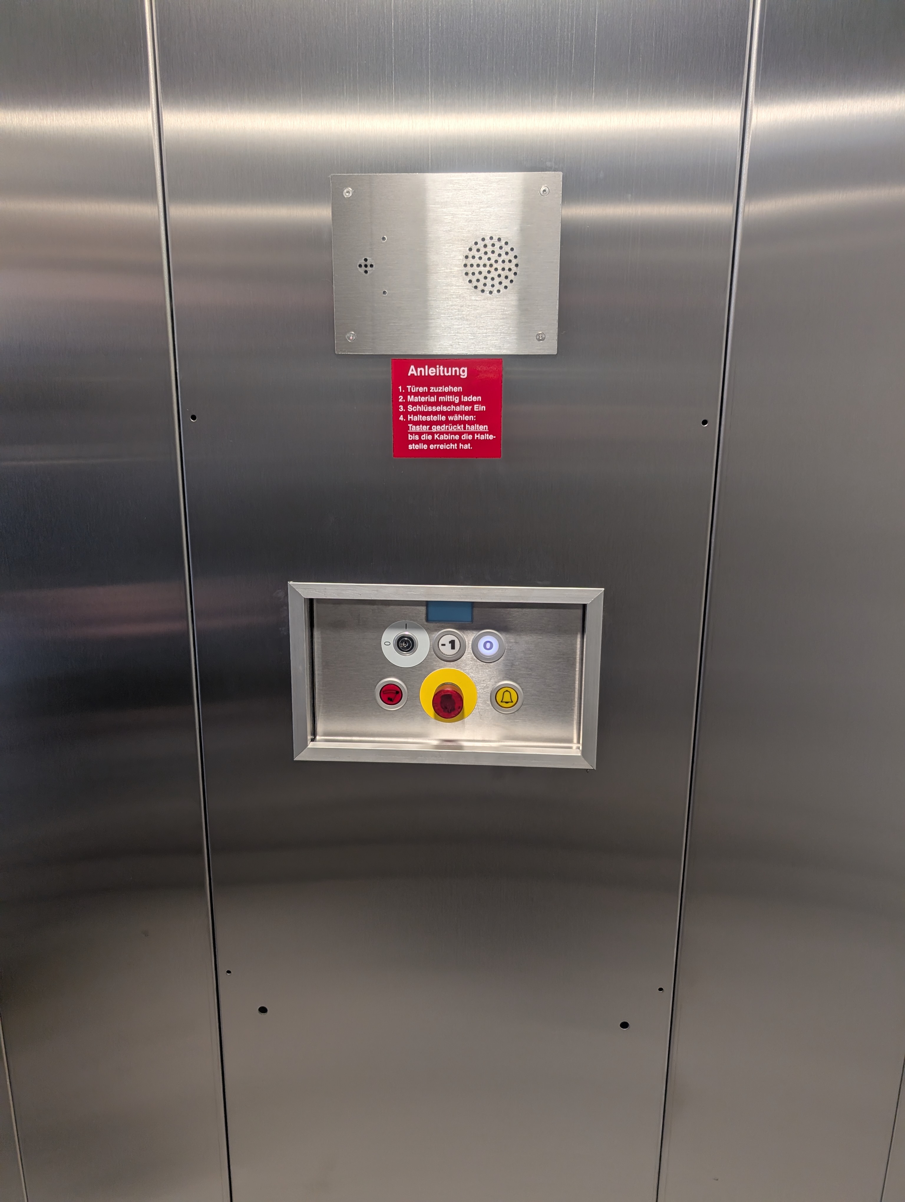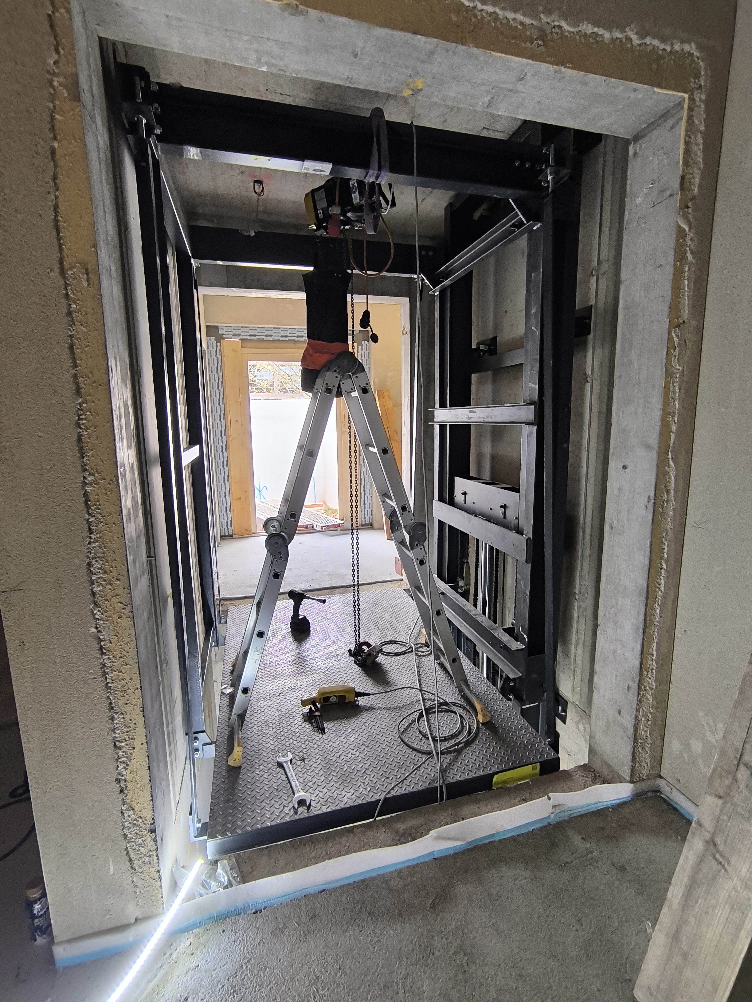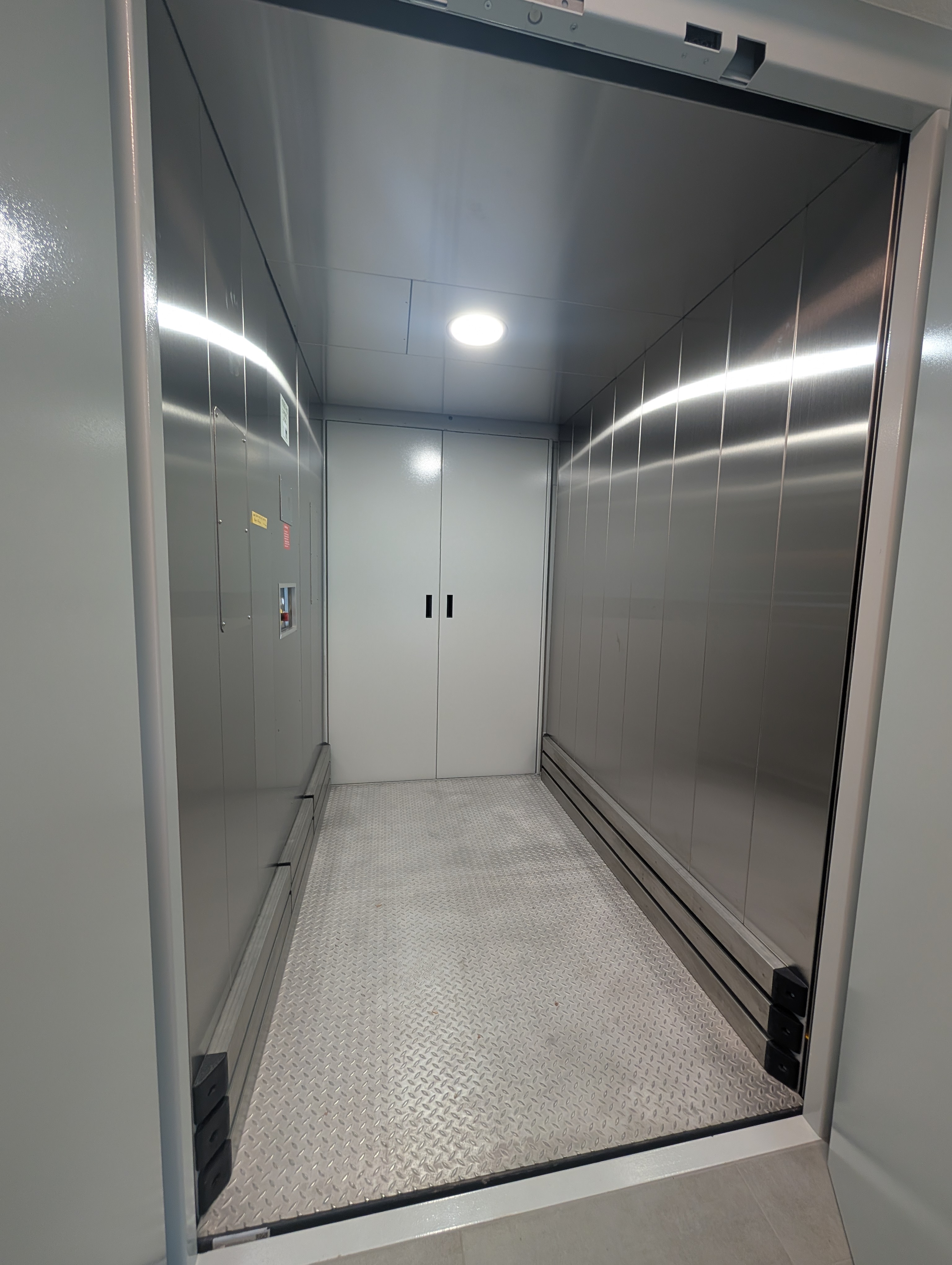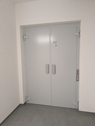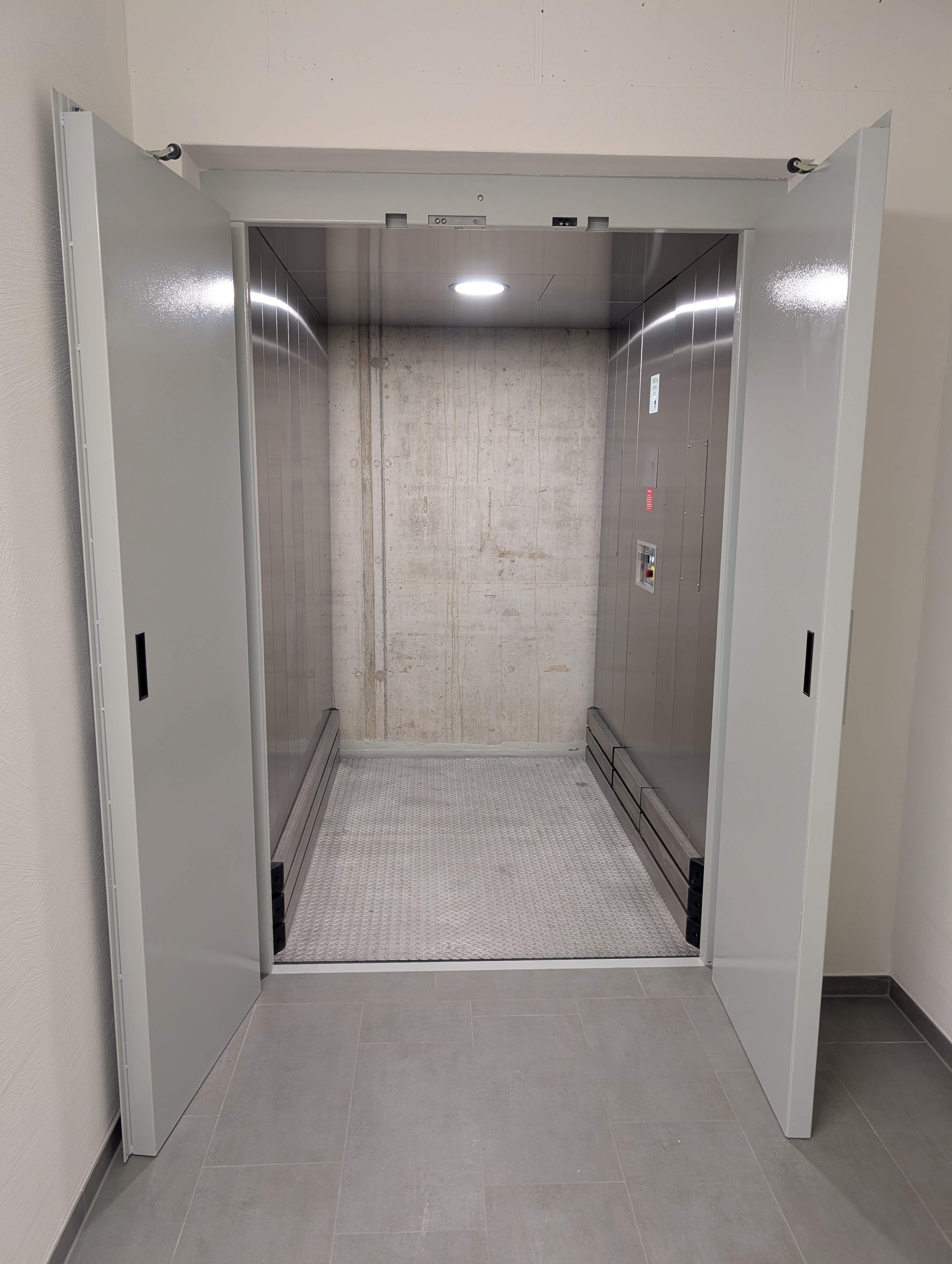 Es handelt sich um einen Warenlift EHM-1500 mit einer Nutzlast von 1000 Kg, 2 Halt, mit Edelstahl Kabine und Drehtüren. In diesem Fall haben wir einen speziellen Kabinenrahmen für reduzierte Schachtgrube eingeplant.