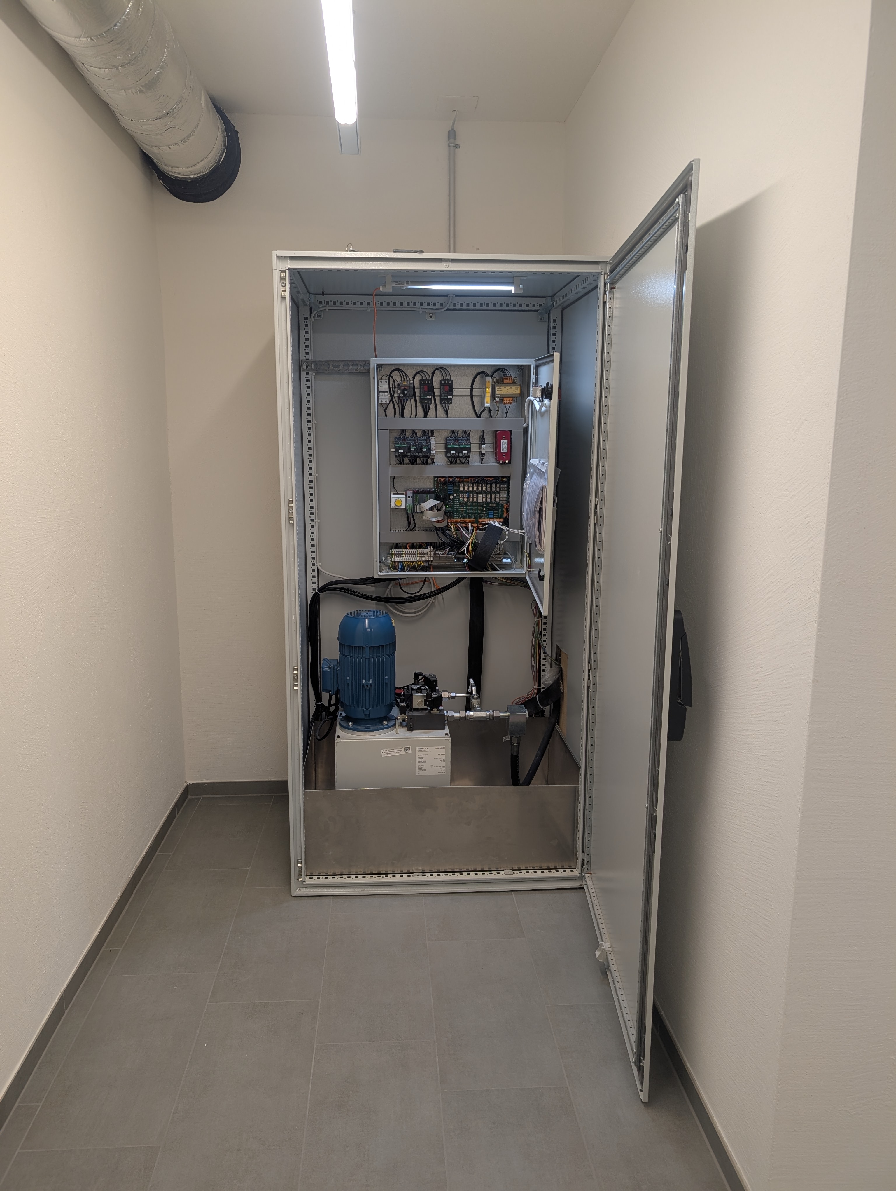 Wie gewohnt, wurde das Aggregat und die Steuerung in einem "all-in-one" Schrank eingebaut (MRL Lösung).