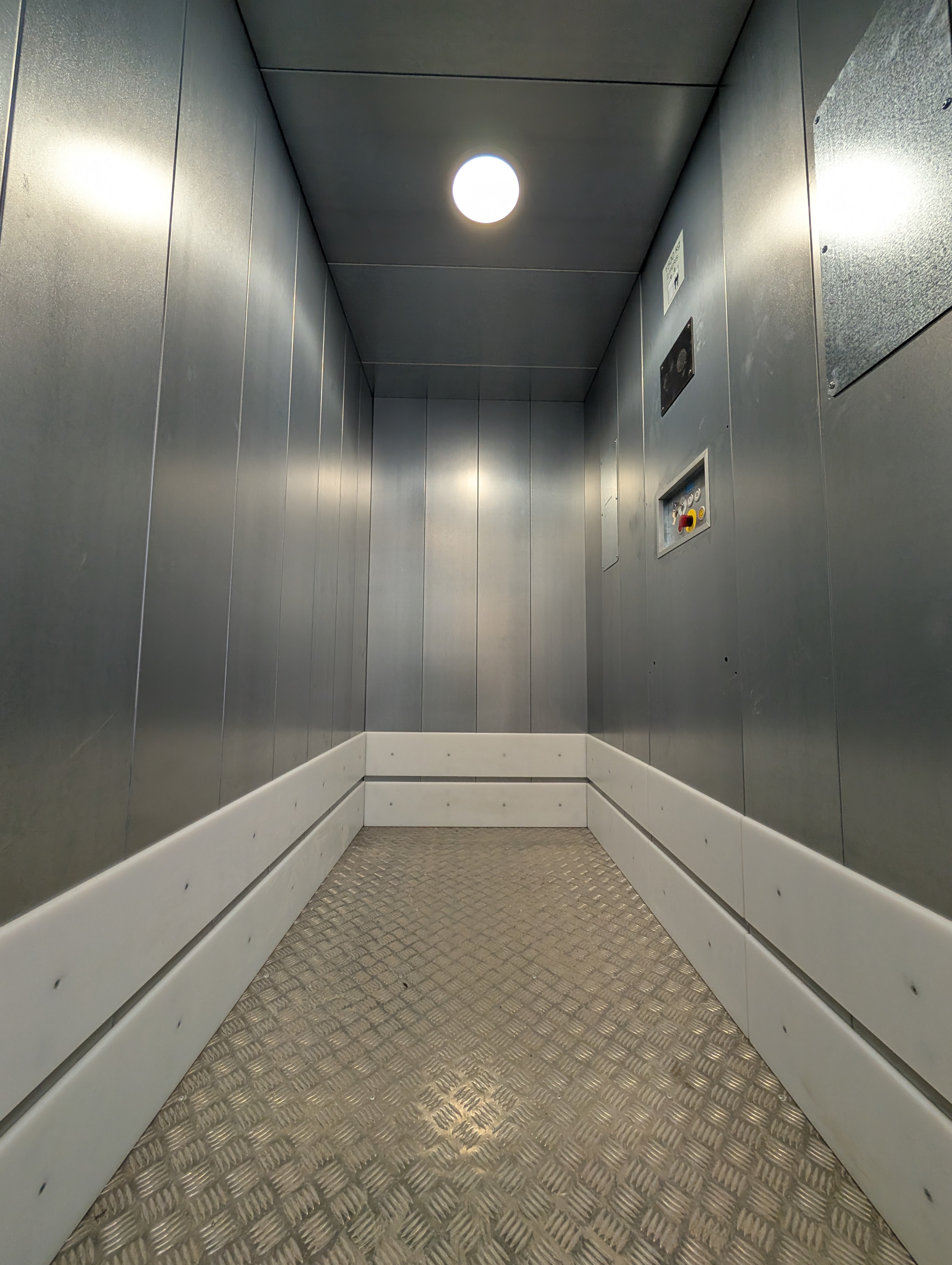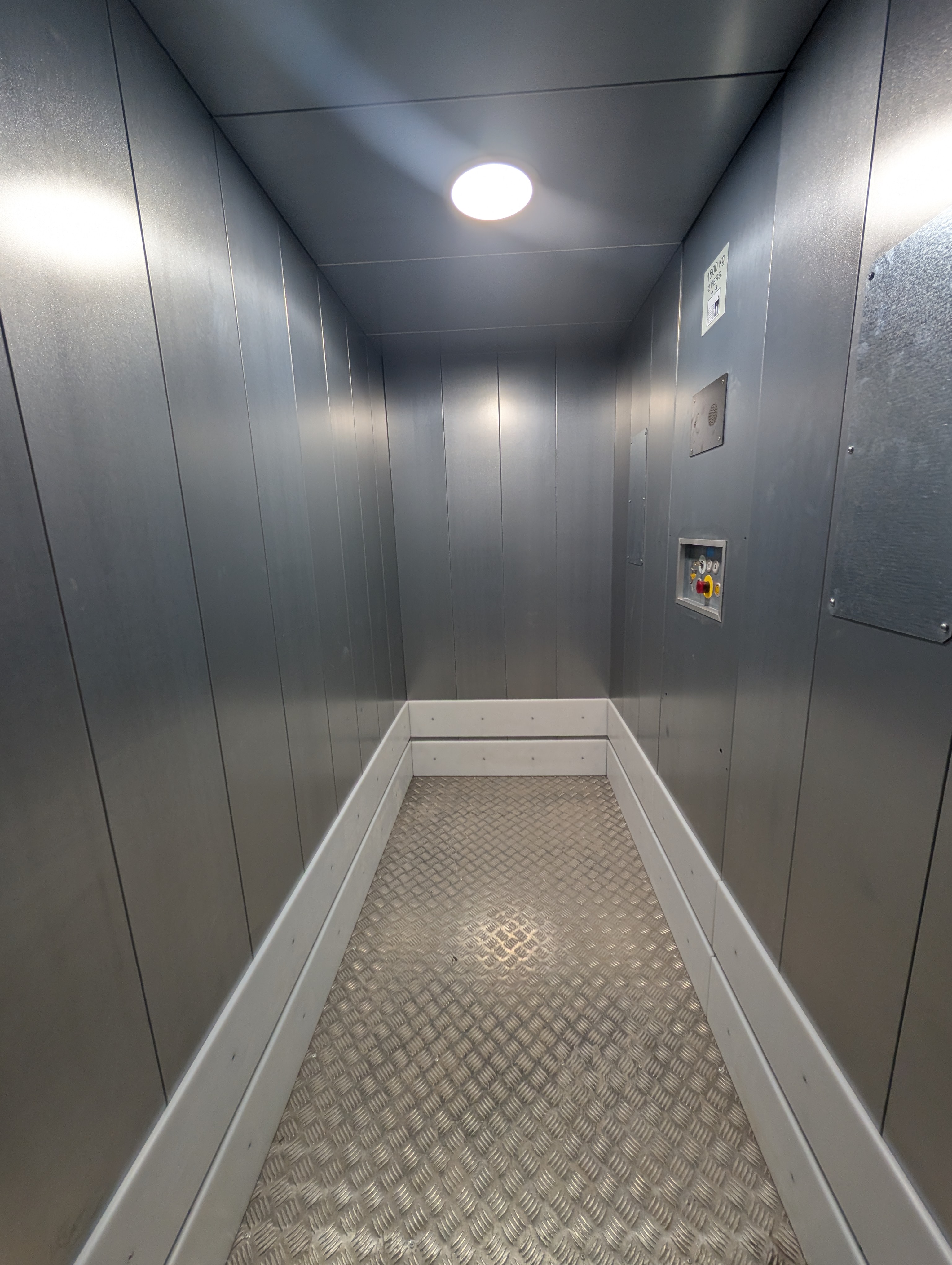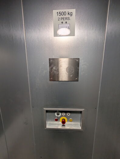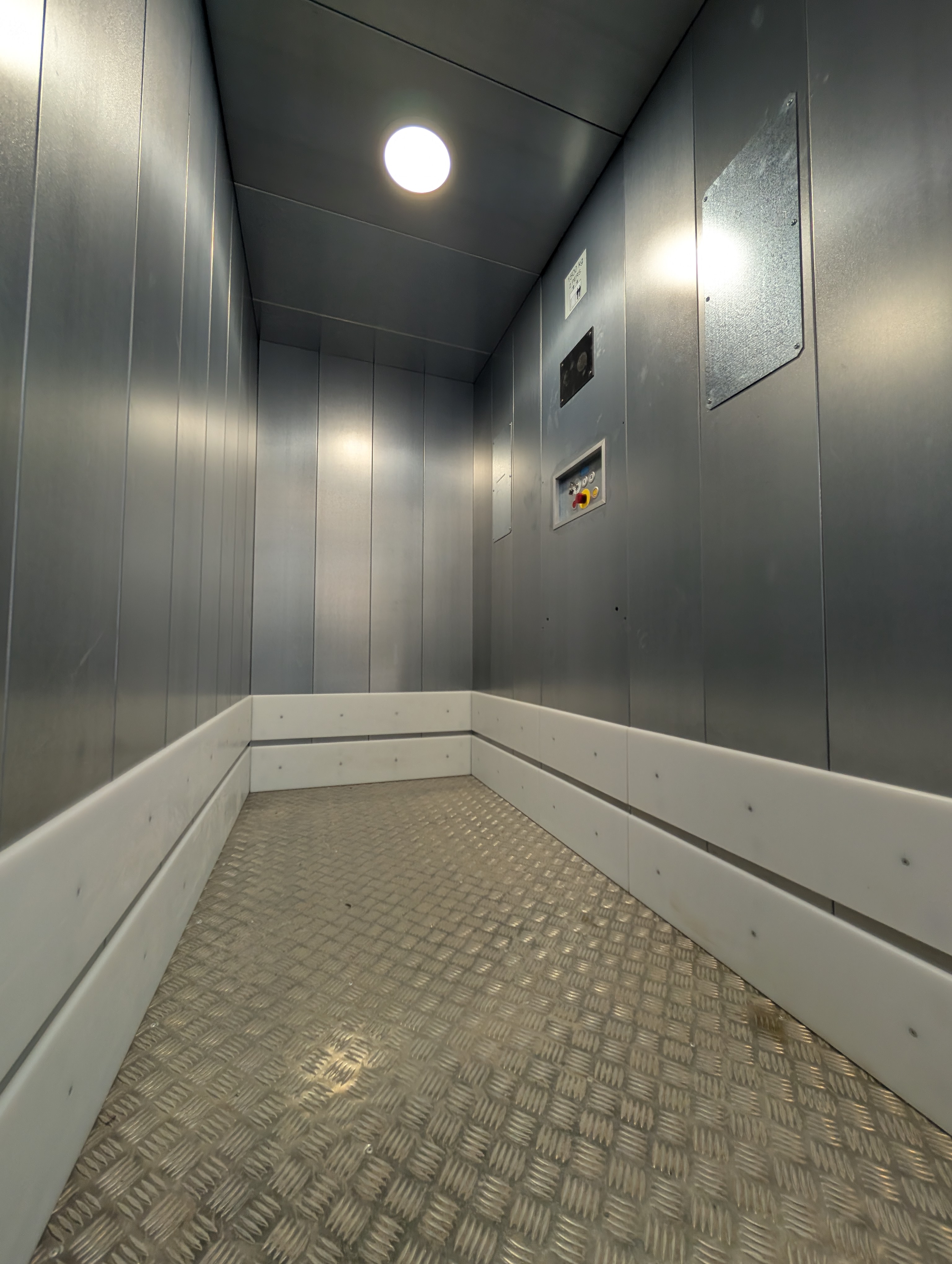 Es handelt sich um einen Warenlift EHM-1500 mit einer Nutzlast von 1500 Kg, 2 Halt, mit Kabine aus Stahlblech verzinkt und spezielle Rammschutzleisten aus PVC.