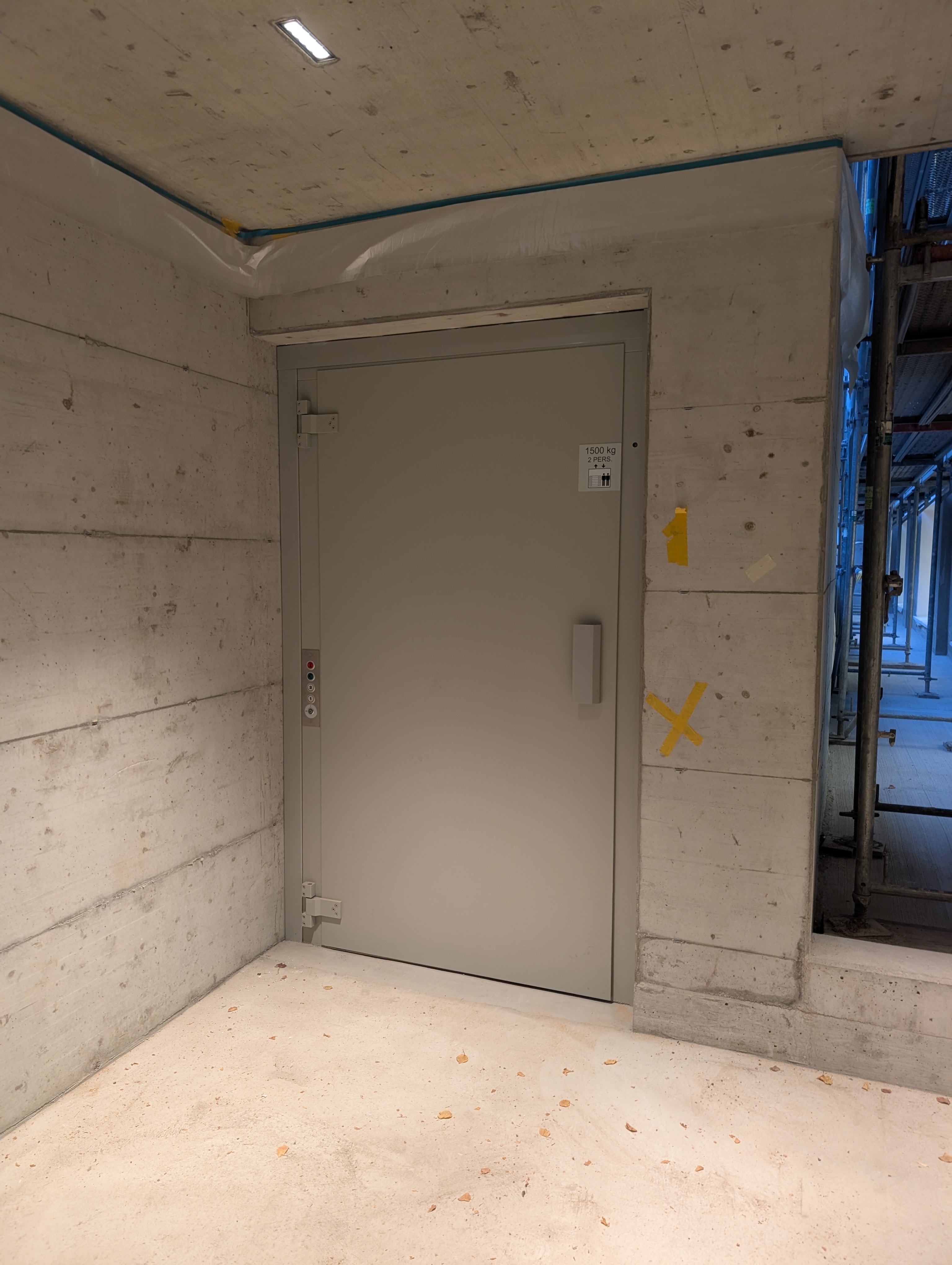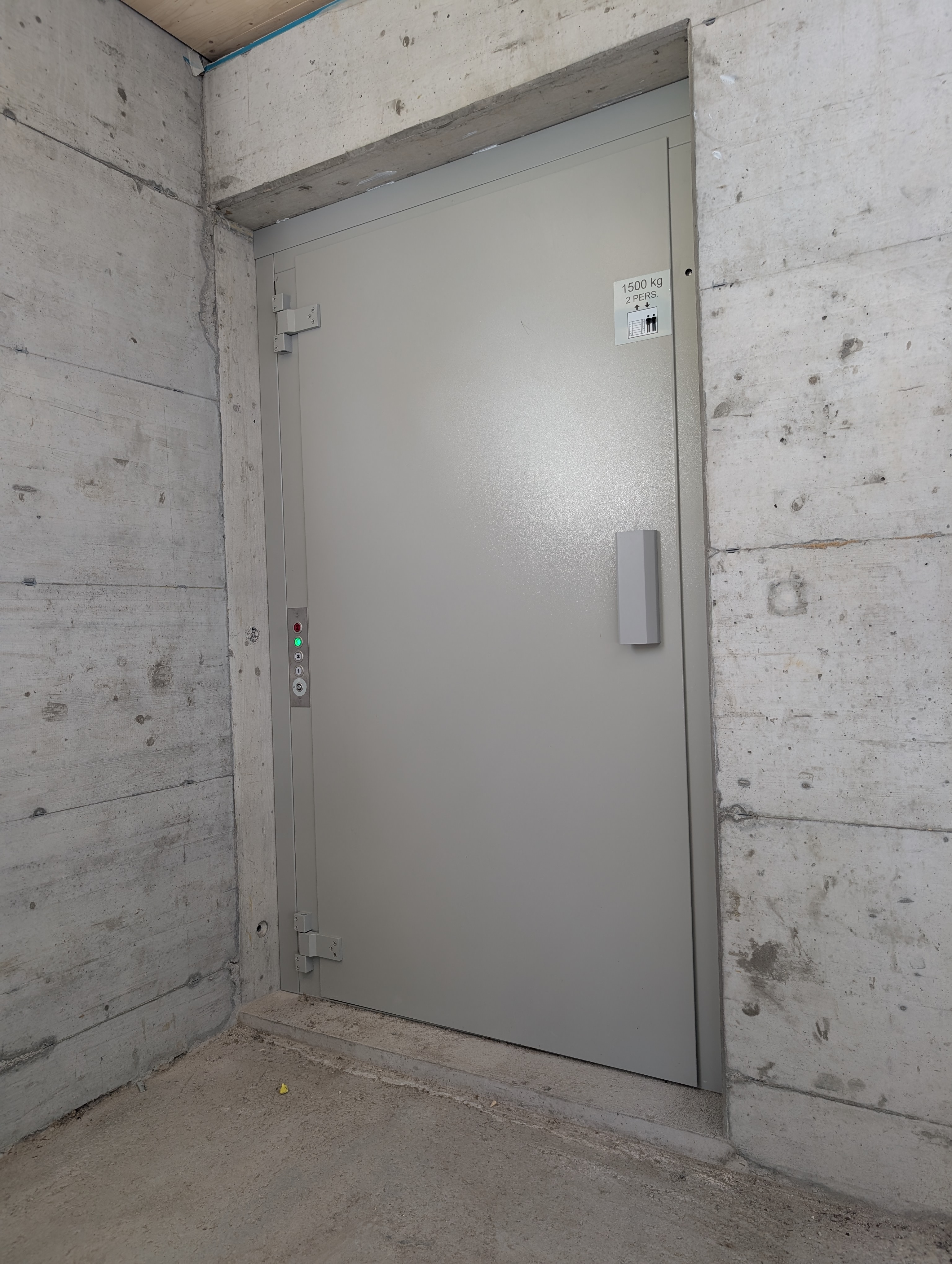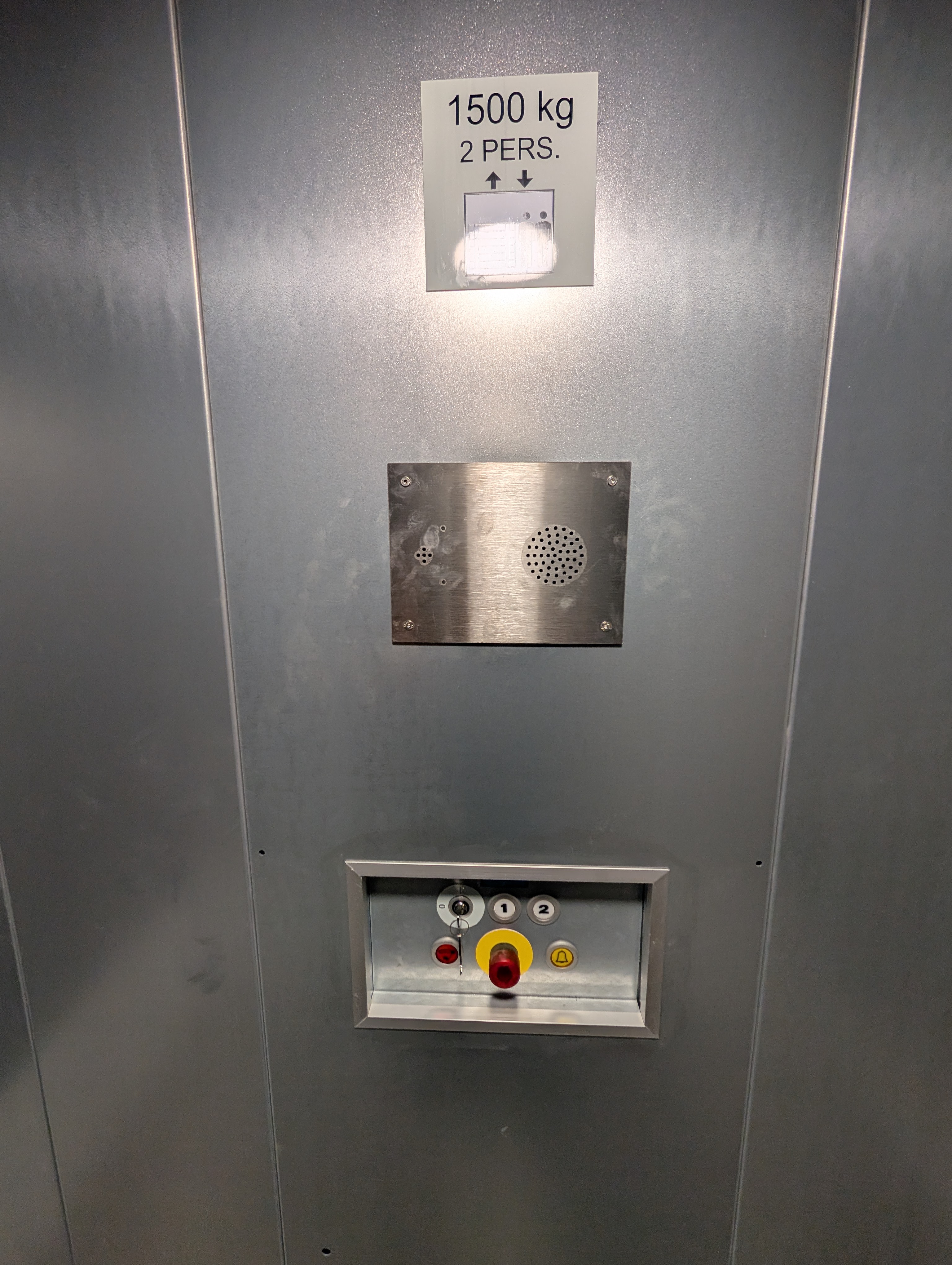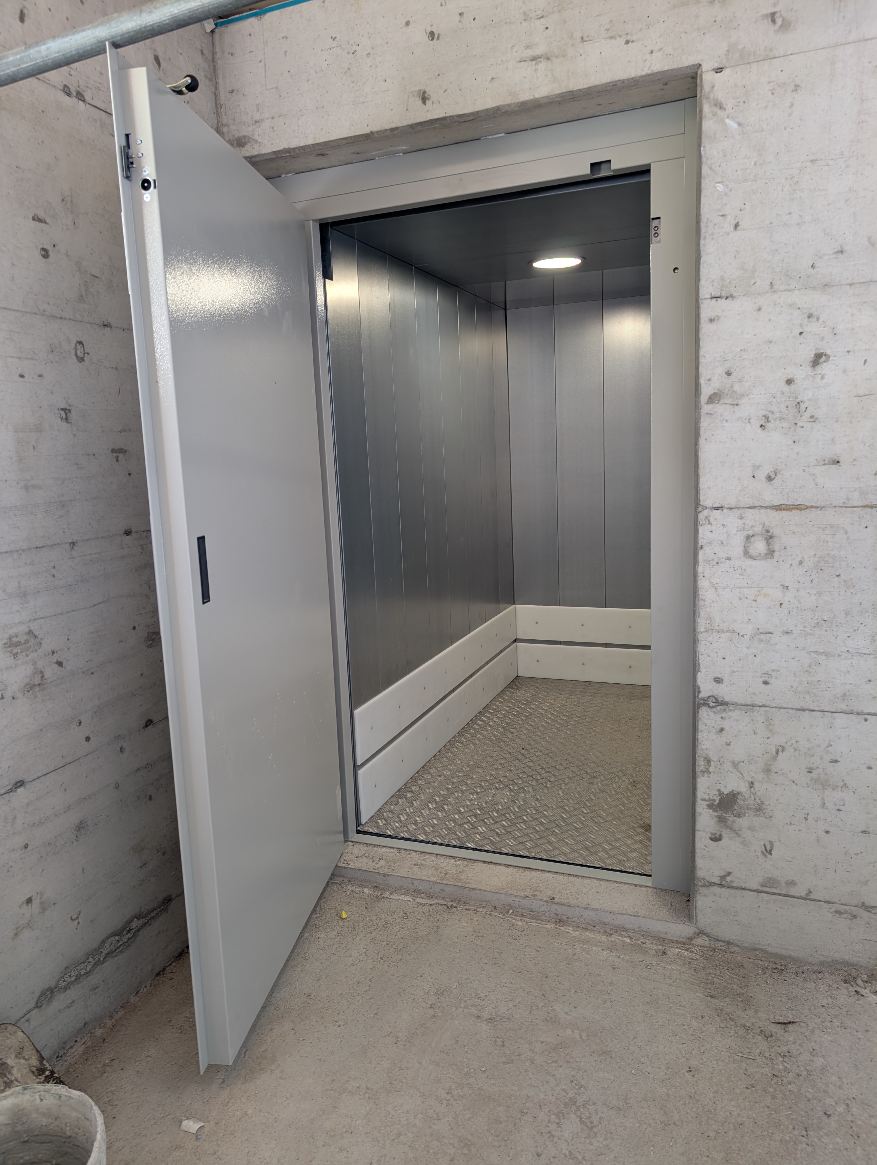 Es handelt sich um einen Warenlift EHM-1500 mit einer Nutzlast von 1500 Kg, 2 Halt, mit Kabine aus Stahlblech verzinkt und spezielle Rammschutzleisten aus PVC.