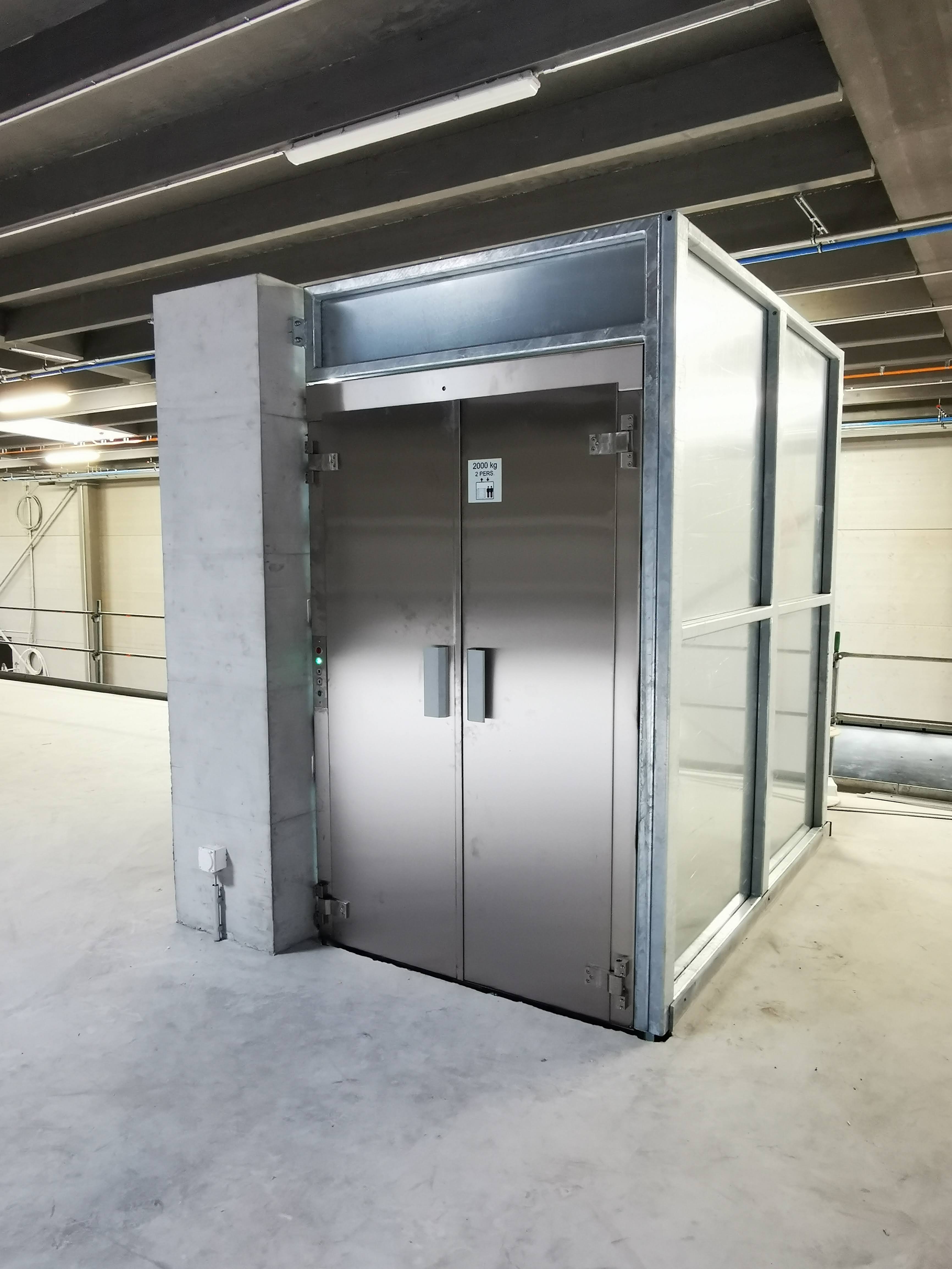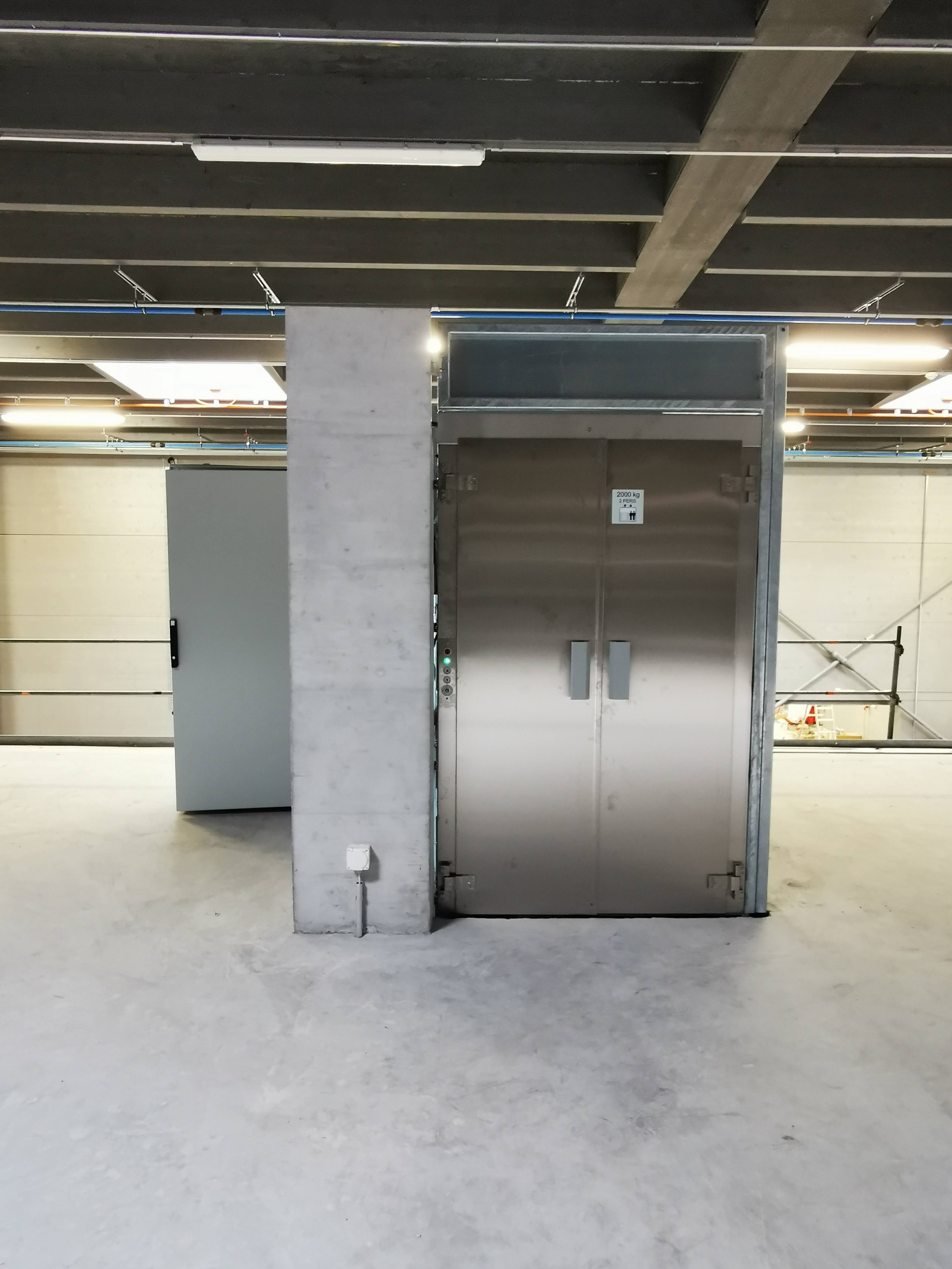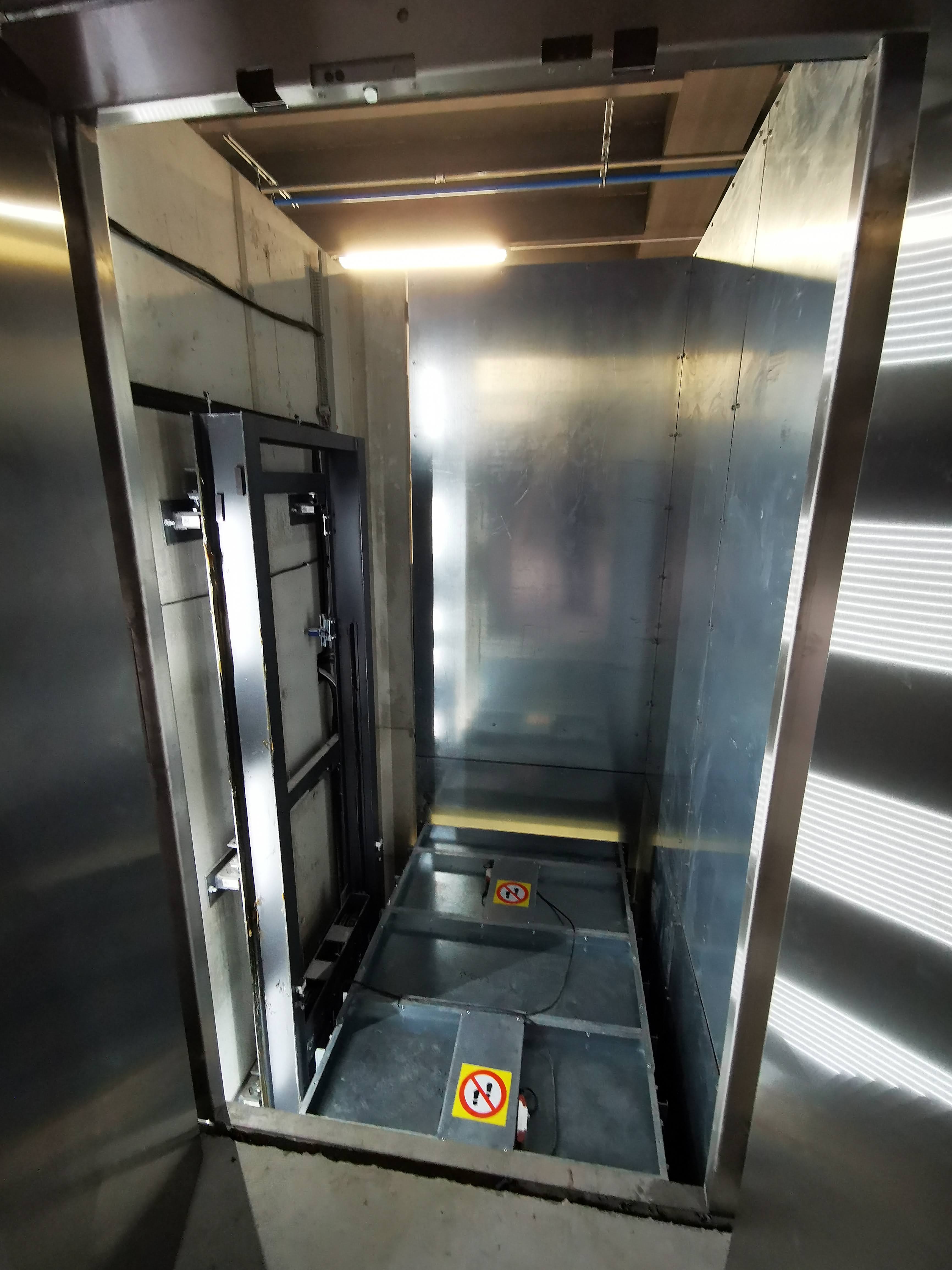 Es handelt sich um einen Warenlift EHM-1500 mit einer Nutzlast von 2000 Kg, 2 Halt, mit hydraulischer Aufsetzvorrichtung und Edelstahl Drehtüren. Der Schacht besteht aus einer Betonwand, an der die Mechanik befestigt wurde, und eine 3-seitige Metallverkleidung aus verzinktem Blech.