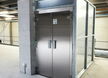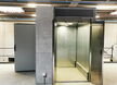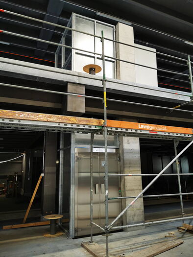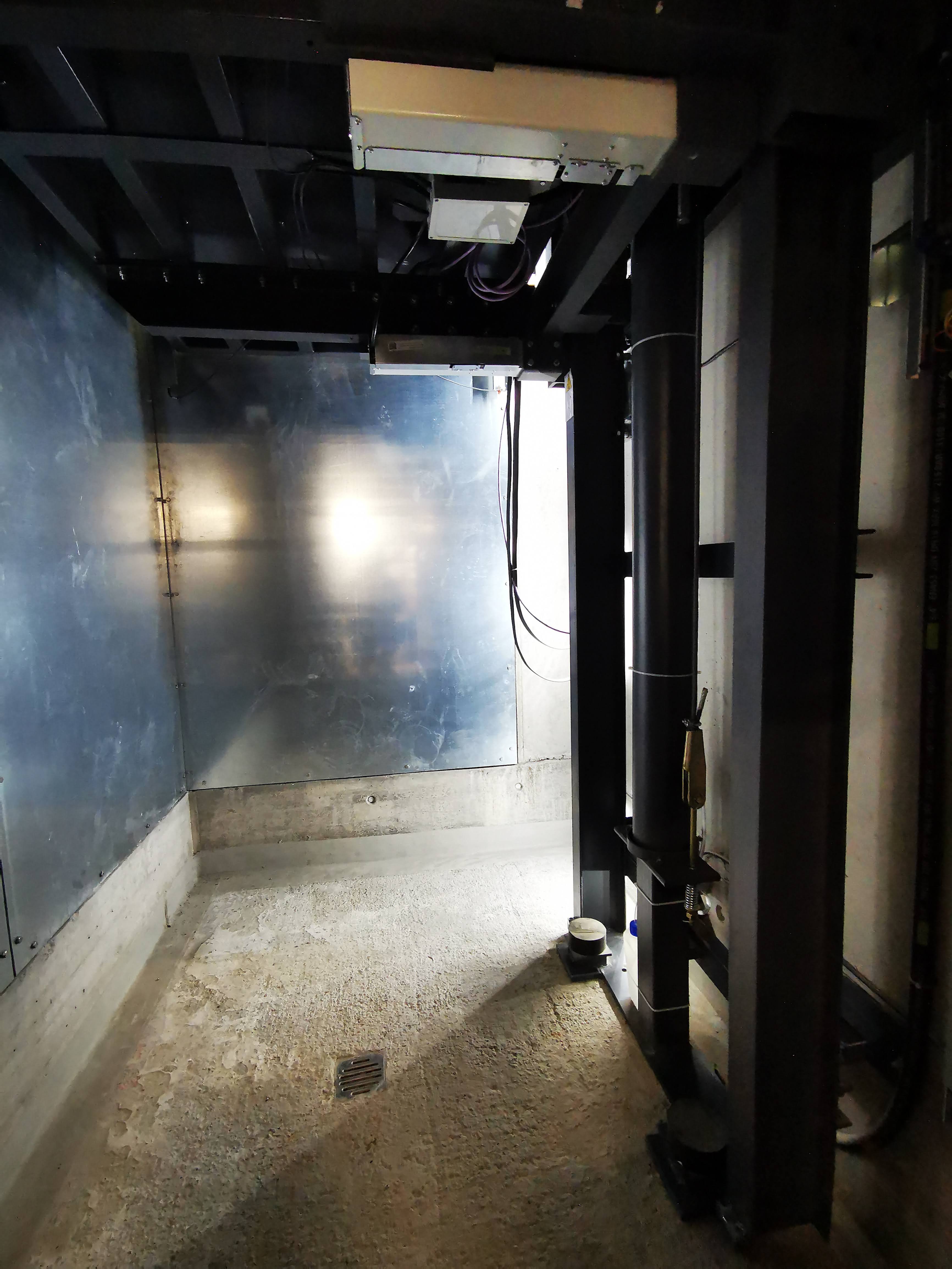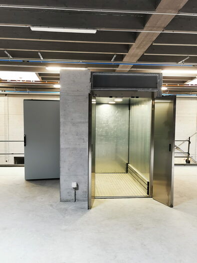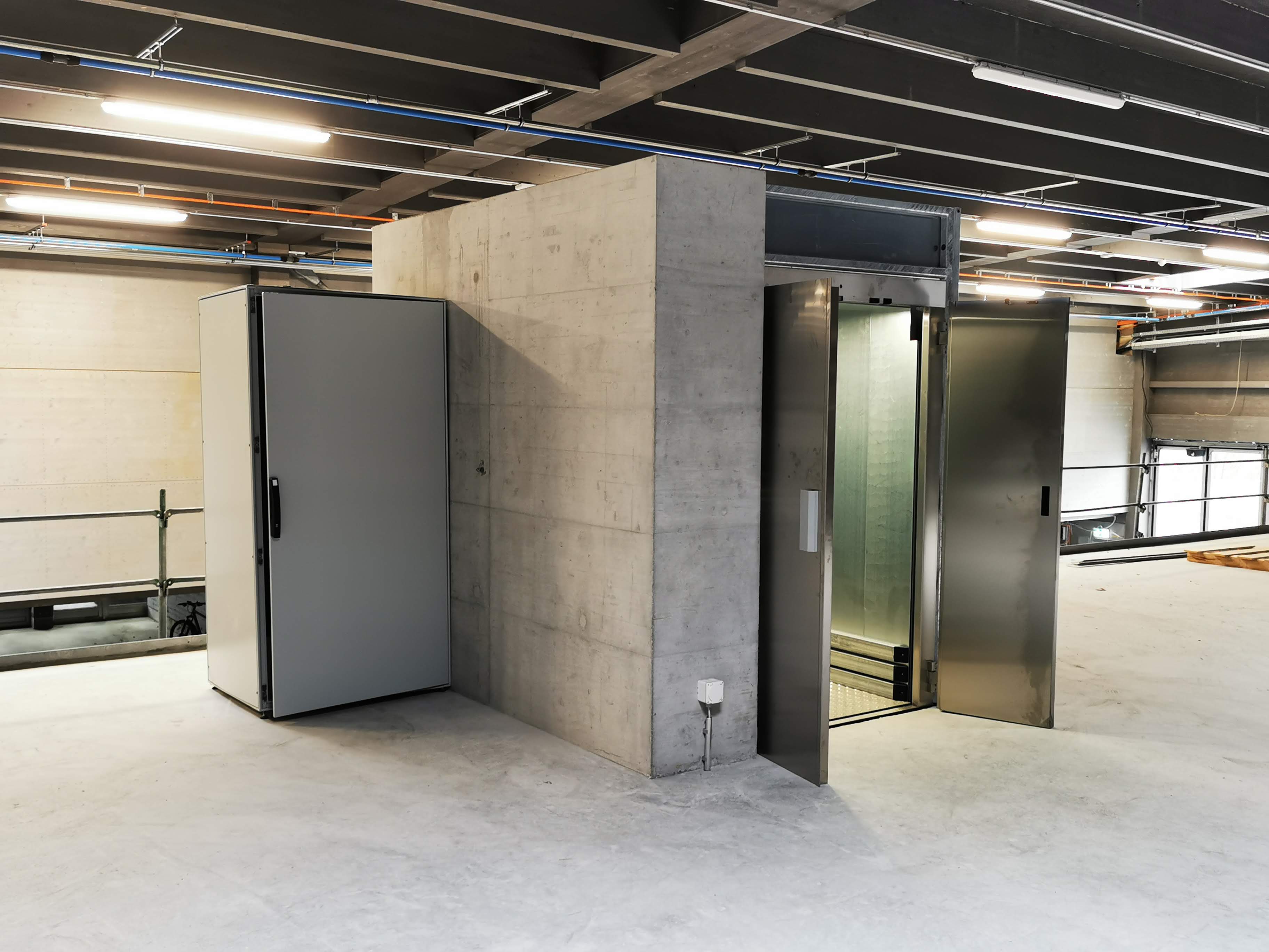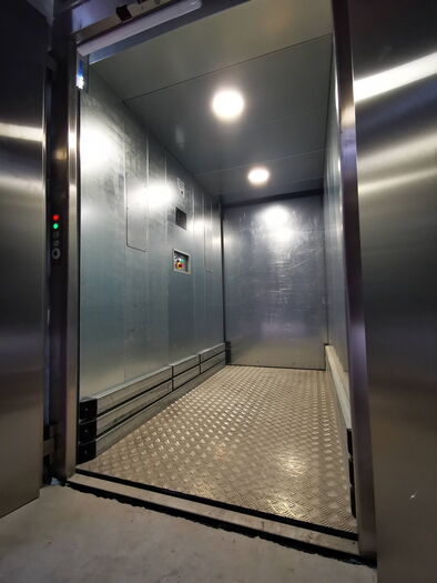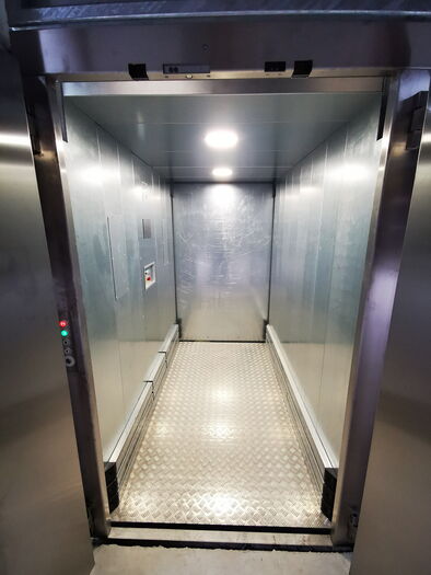 Es handelt sich um einen Warenlift EHM-1500 mit einer Nutzlast von 2000 Kg, 2 Halt, mit hydraulischer Aufsetzvorrichtung und Edelstahl Drehtüren. Der Schacht besteht aus einer Betonwand, an der die Mechanik befestigt wurde, und eine 3-seitige Metallverkleidung aus verzinktem Blech.