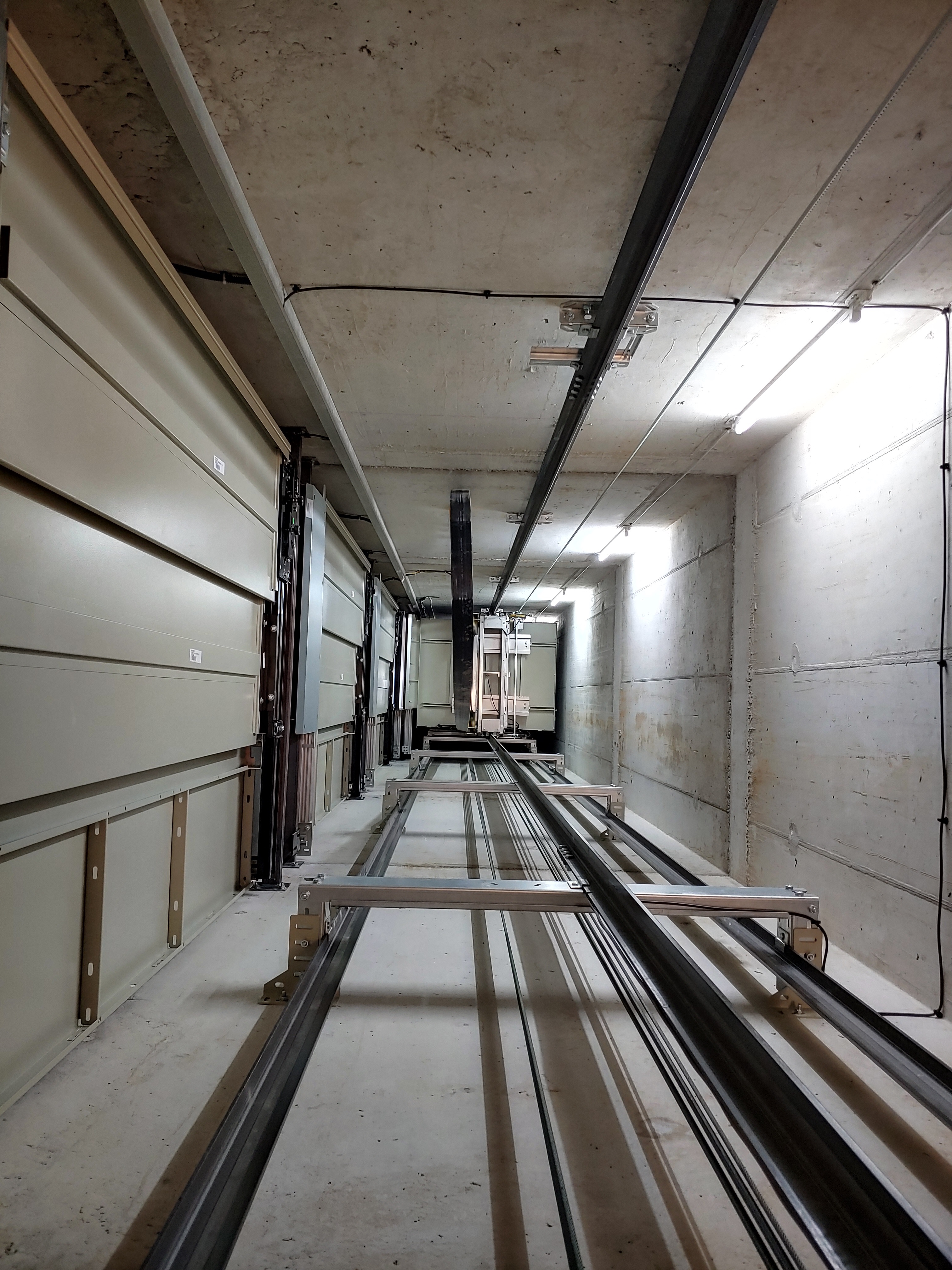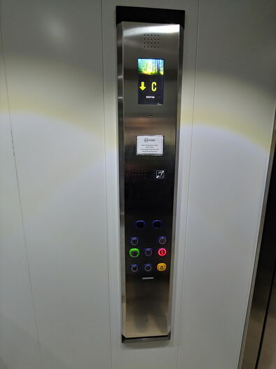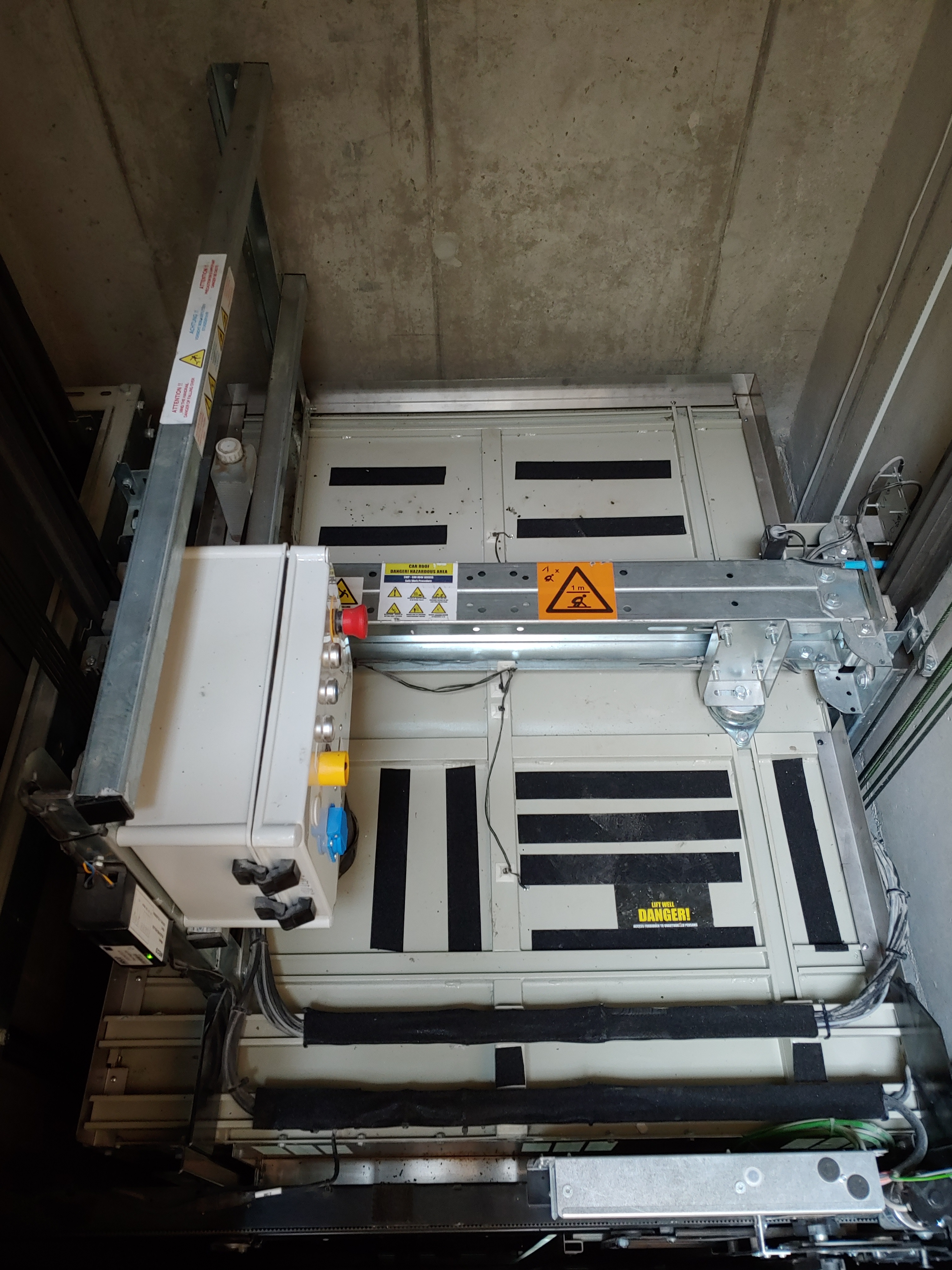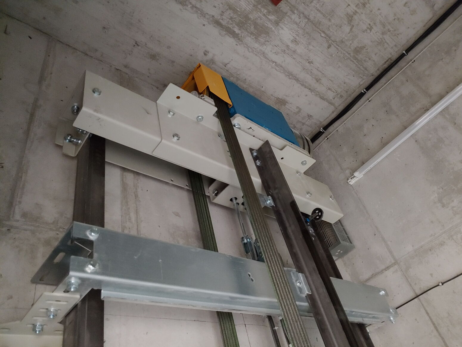 Anlage mit 5 Haltestellen, 630 Kg Nutzlast und eine Geschwindigkeit von 1 m/s. Aufhängung 2:1, behindertgerecht.