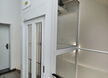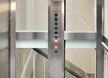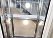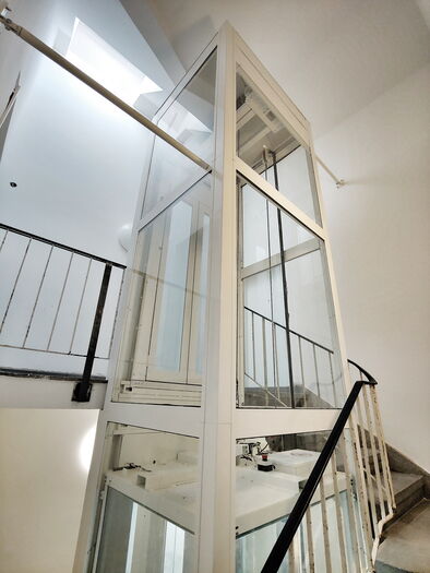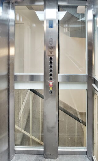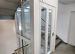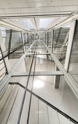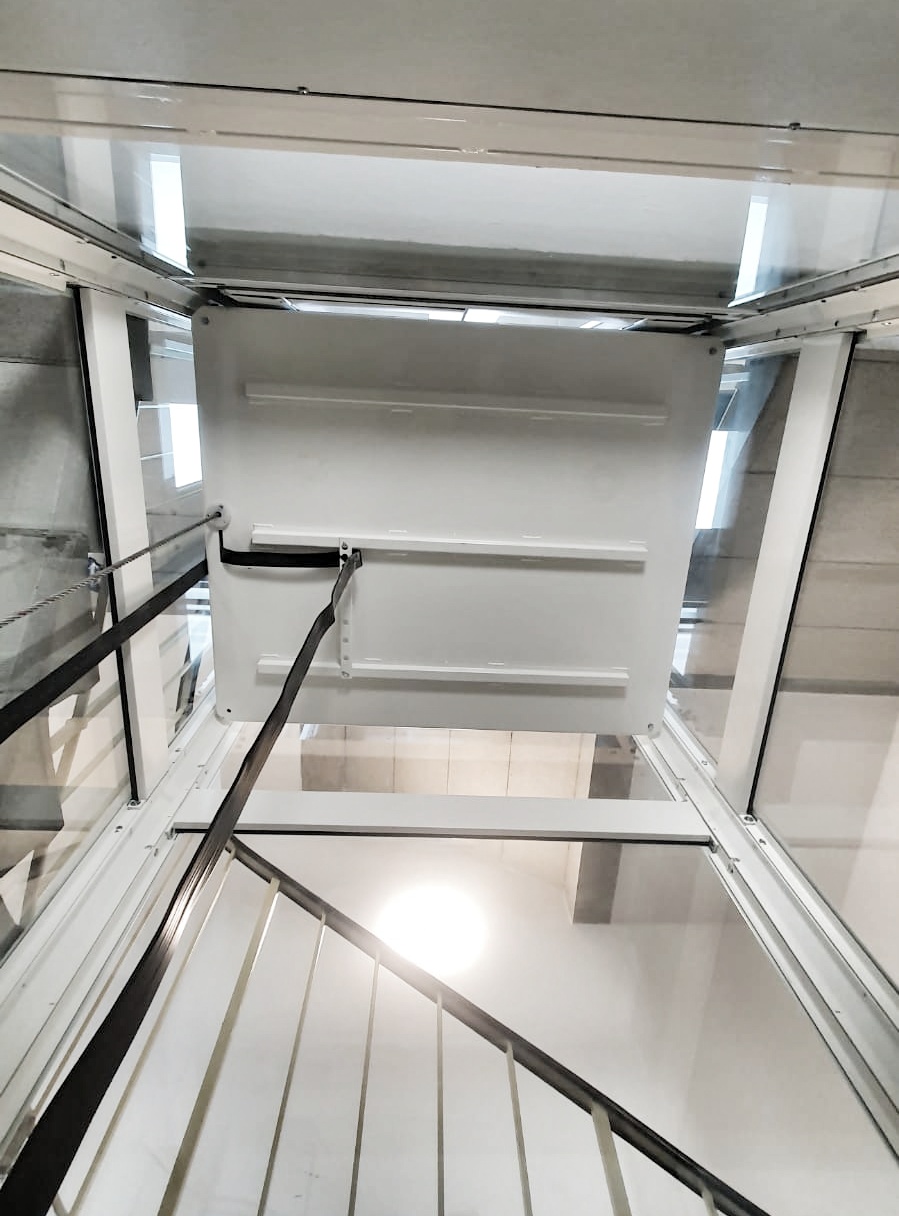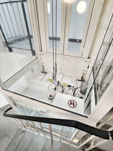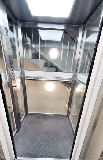 Personenlift ohne Kabinenabschlusstür, mit Lichtvorhang vor jedem Kabinenzugang. Gegensprechanlage mit GSM, automatische Fahrt zur untersten Halt bei Stromausfall. Trommelantrieb im Schachtkopf, Steuerung in der untersten Halt. Automatische zentral öffnenende Schachttüre aus Glas mit Stahlblech Rahmen 9010.