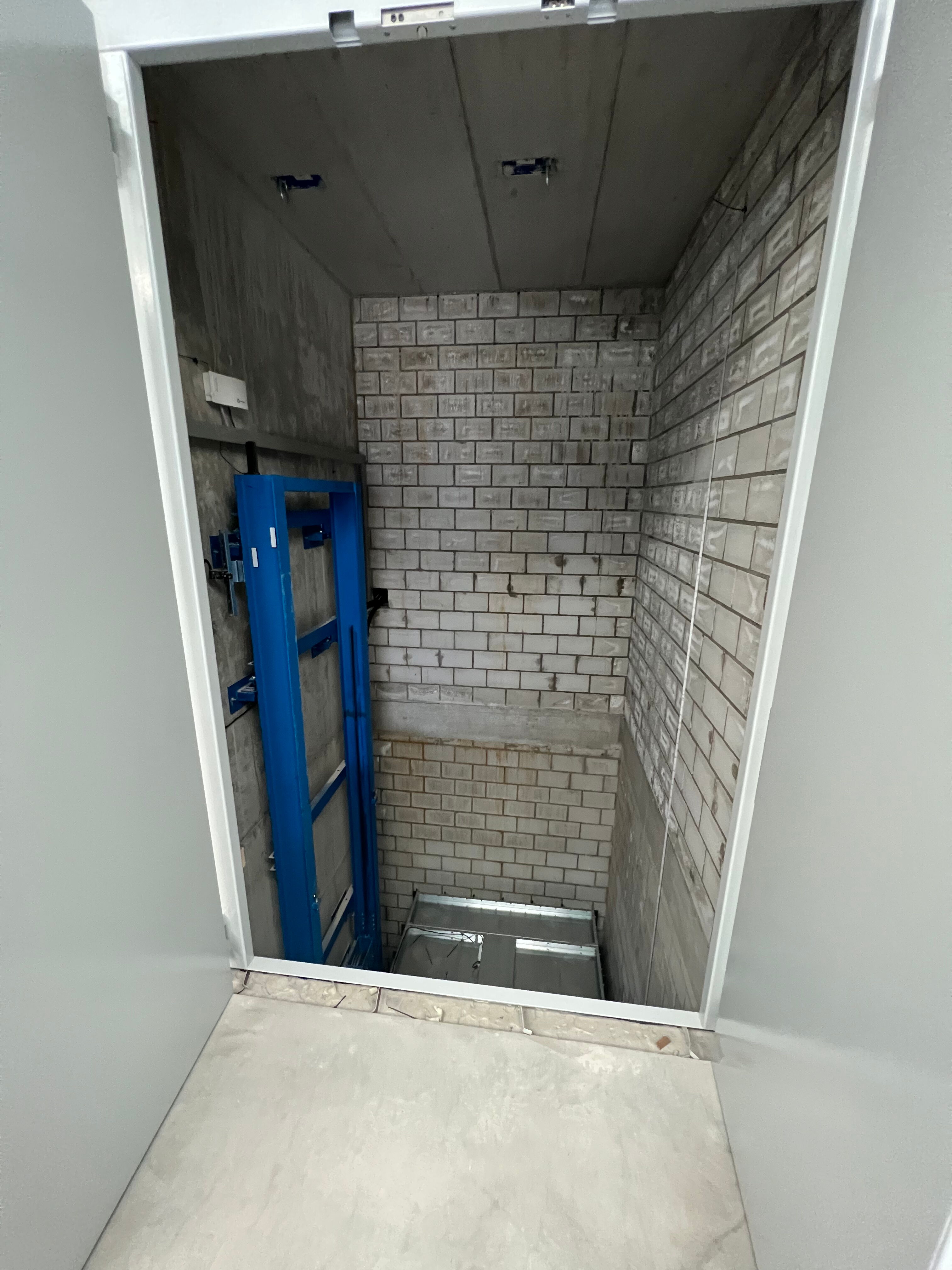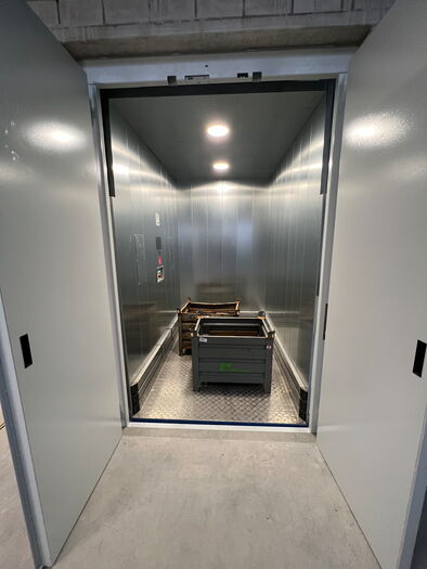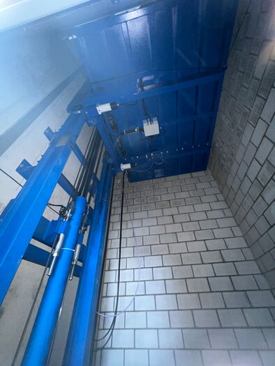 Es handelt sich um einen Warenlift EHM-1500 mit einer Nutzlast von 1500 Kg, 2 Halt, mit Kabine aus Stahlblech verzinkt und Aluminium Boden. Diese Anlage verfügt über Aufsetzvorrichtung für ein sicheres Laden der Plattform in jeder Haltestelle.